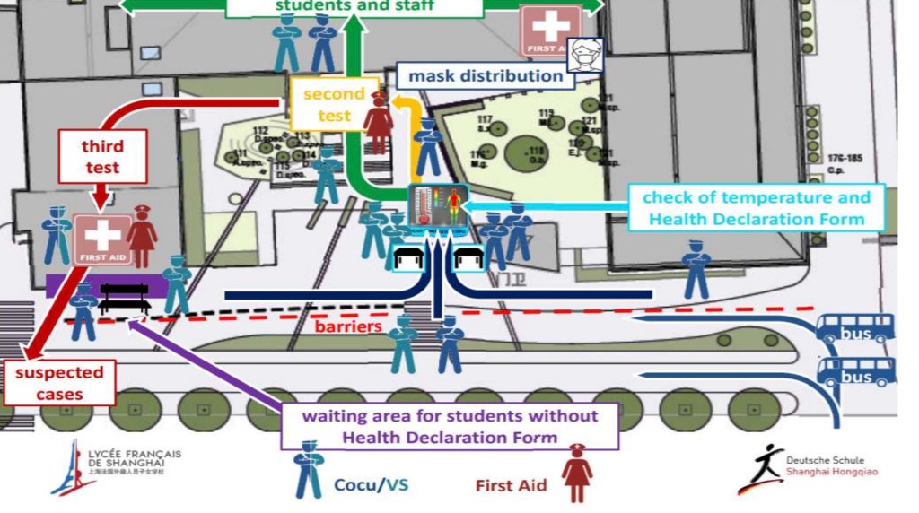 Comme vous le voyez, cette organisation titanesque est assez incroyable, et je ne peux que saluer et remercier toutes les équipes impliquées au lycée ! Même si l’ambiance est un peu particulière en ces premiers jours de reprise, je reste persuadée que c’est important, pour tous ceux qui le peuvent, de retrouver le chemin de l’école – puisque la situation sanitaire le permet ici à Shanghai. Pour reprendre ses marques, pour retrouver quelques repères, pour finir l’année. C’est sûr, le réveil de 6h30 le matin, les longs trajets en bus, les cours de 8h à 18h ou 18h30, les activités sportives annulées et ce masque toute la journée, « ça me déprime ! » dit-on chez nous… Mais le e-learning n’est pas la vocation de nos lycées, donc voyons cela comme une chance !