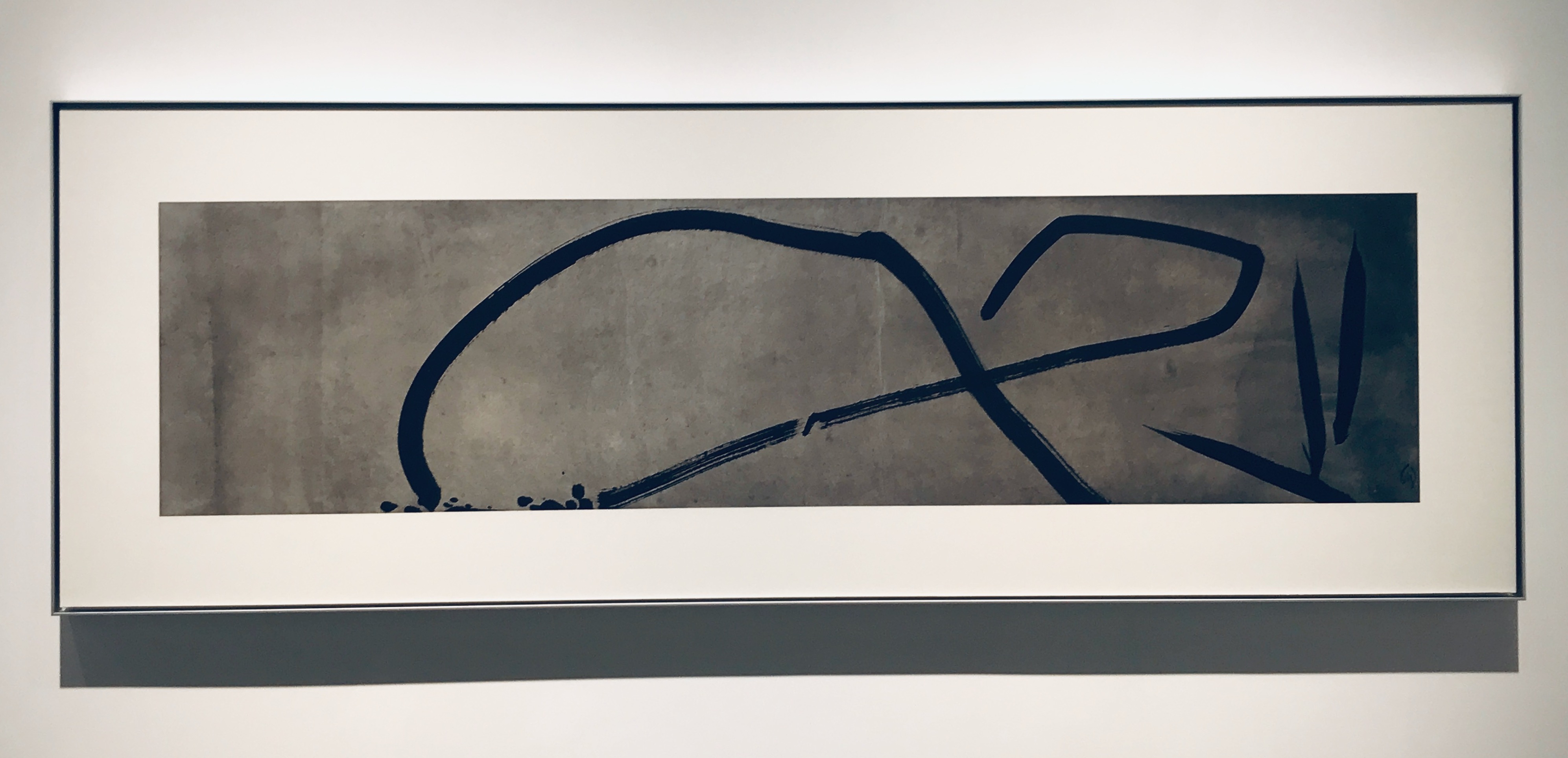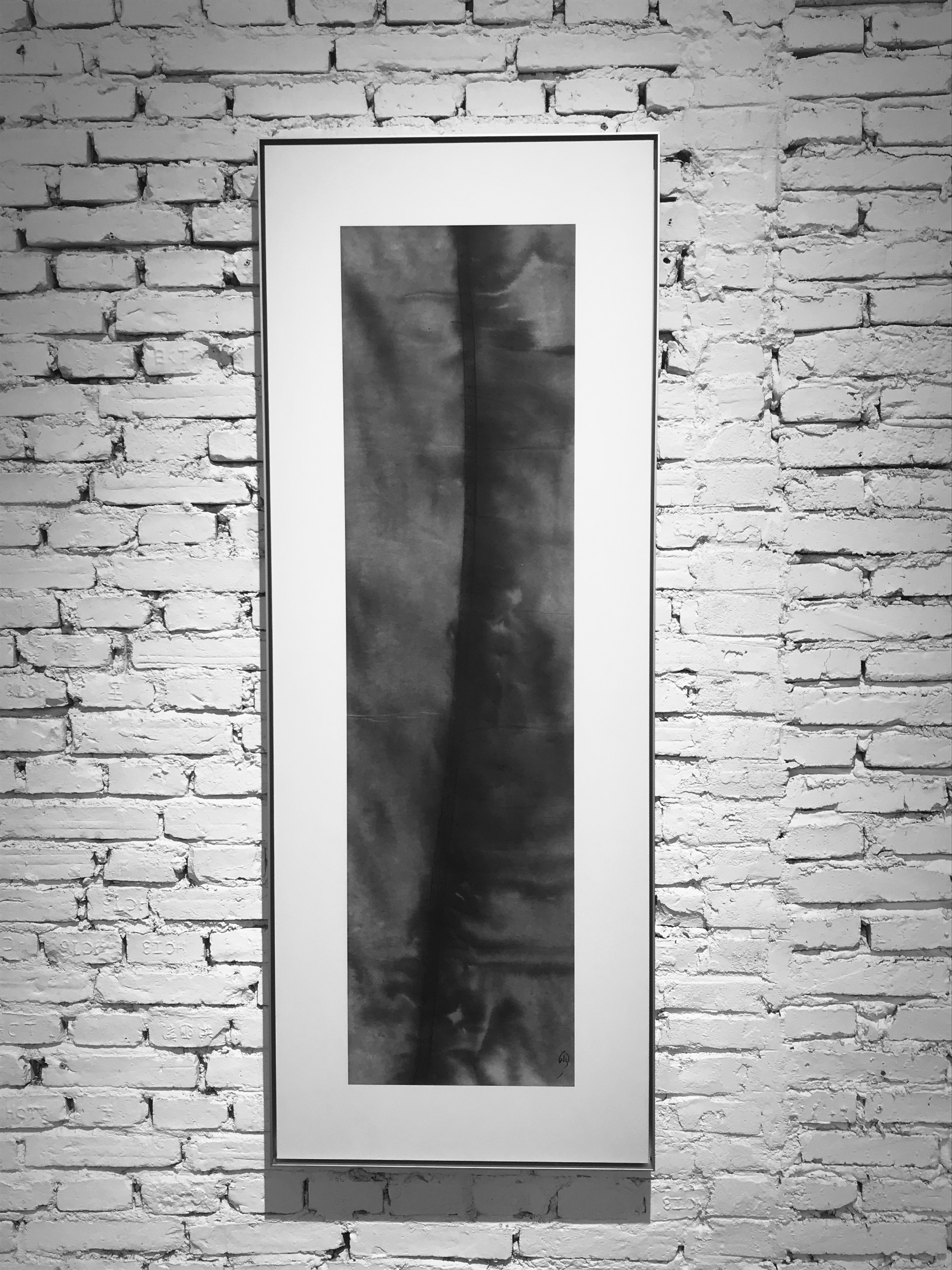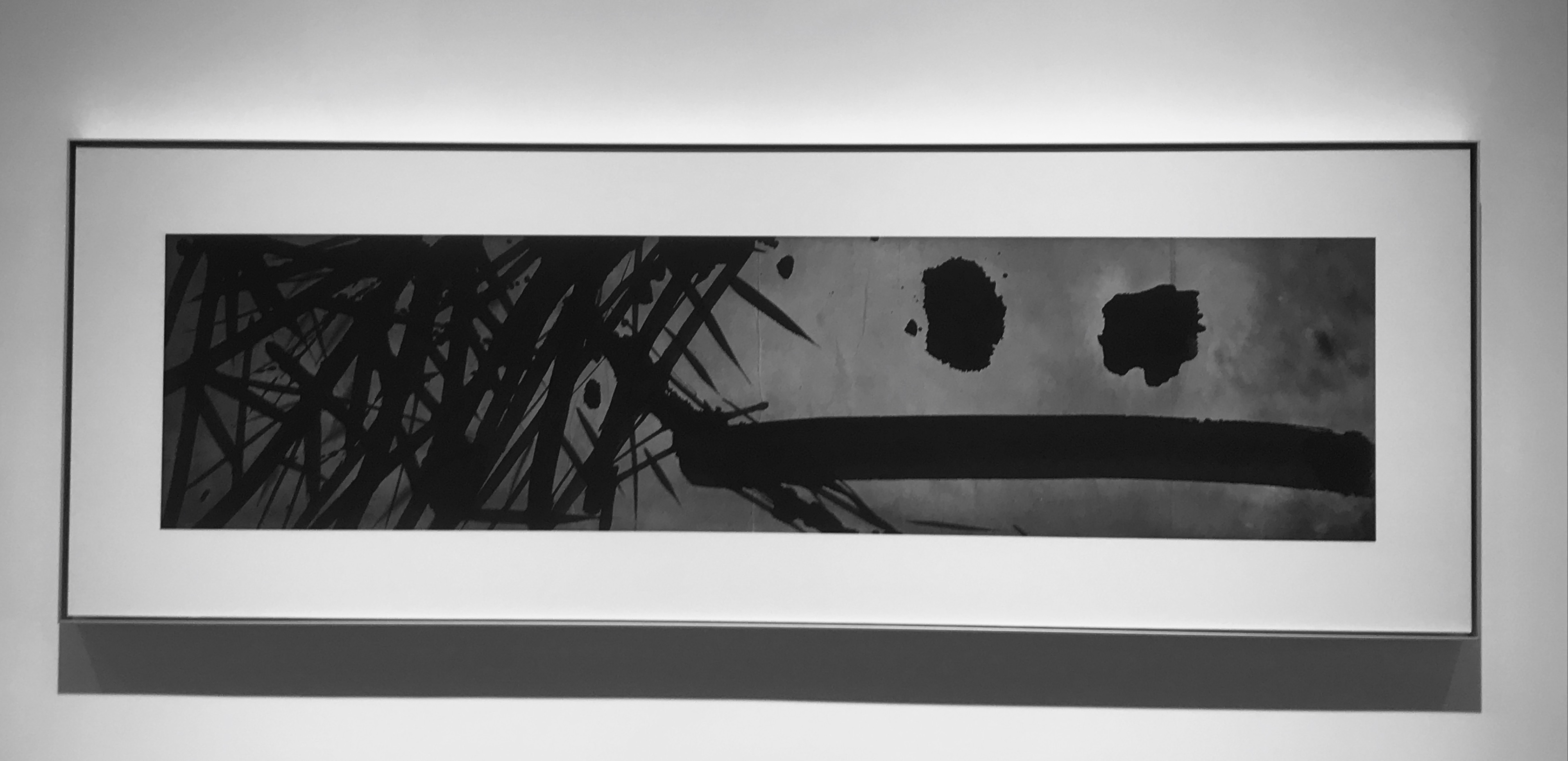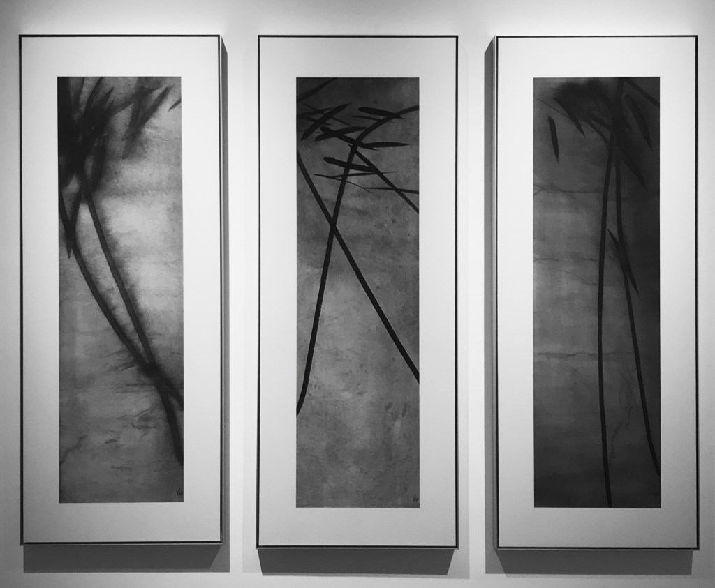 Du papier de lin brut, de l’encre noir profond, un large pinceau, et Dai Mouyu peint la liberté. Avec une multitude de nuances de gris, noirs, beiges, un trait de pinceau majeur, accompagné de ces éclaboussures, ces imperfections, qui justement tendent vers la beauté, il crée un style calligraphique unique. Il s’arroge le droit de se faire abstrait, ou figuratif selon l’œil qui le regarde. Certains verront des bambous, des roseaux, une algue marine, d’autres distingueront la skyline de Shanghai, ou le signe de l’infini. Le trait noir est affirmé, puissant mais sait aussi se faire léger, comme flottant ou en pointillé. Les lignes se croisent et peuvent déborder du cadre, comme animées d’une énergie, d’une tension, pour finir leur envol en légèreté.