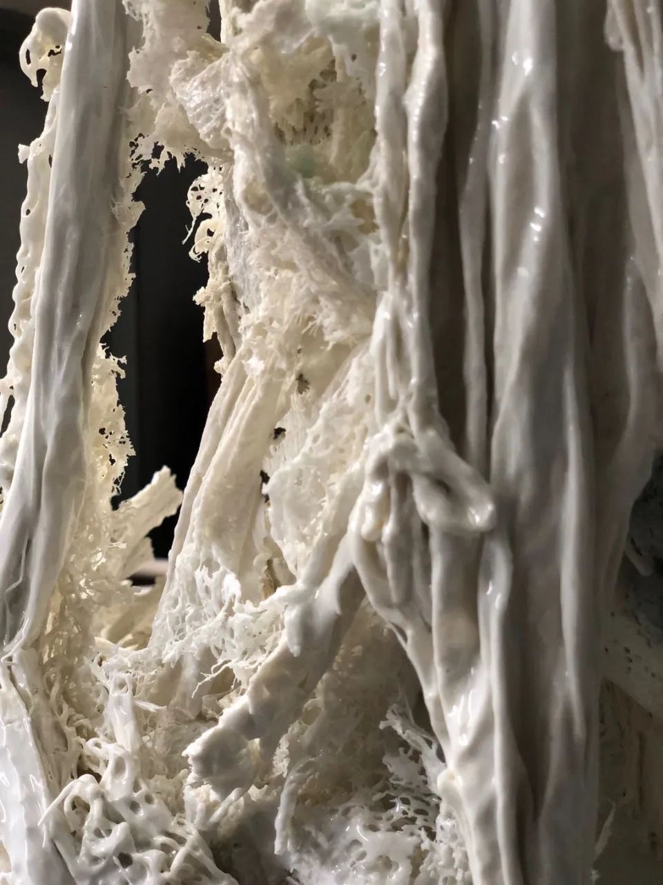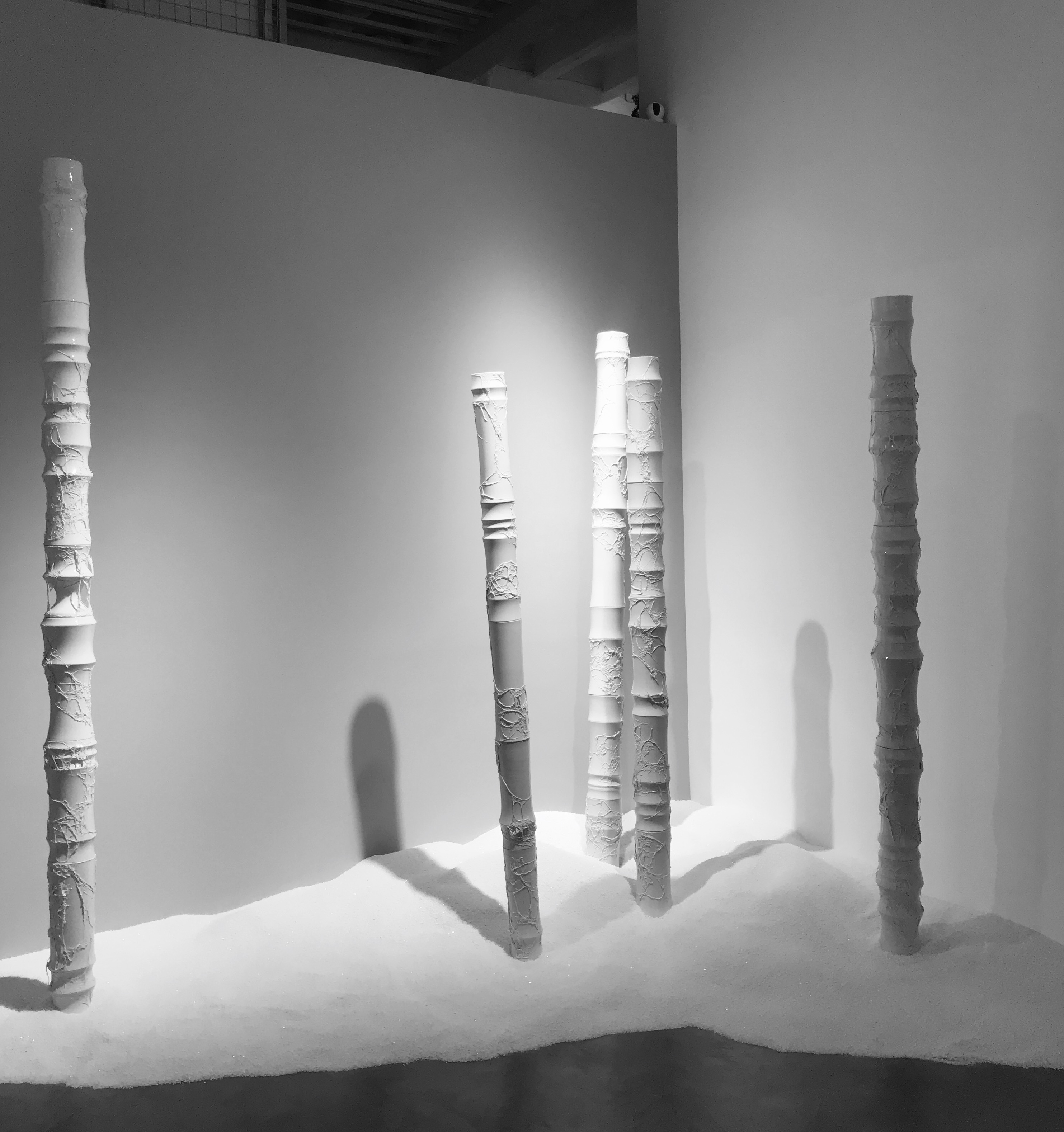 Certaines pièces sont intrigantes, fascinantes, mais d’autres m’ont comme un peu angoissée, je dois l’avouer… Il reste que les majestueuses colonnes de bambous, toujours en céramique, sur lesquelles s’enroulent les prémices du maillage d’un cocon de ver à soie, sont assez impressionnantes. Celles-ci furent d’ailleurs le point de départ de cette série Cocoon (茧 Jian) .