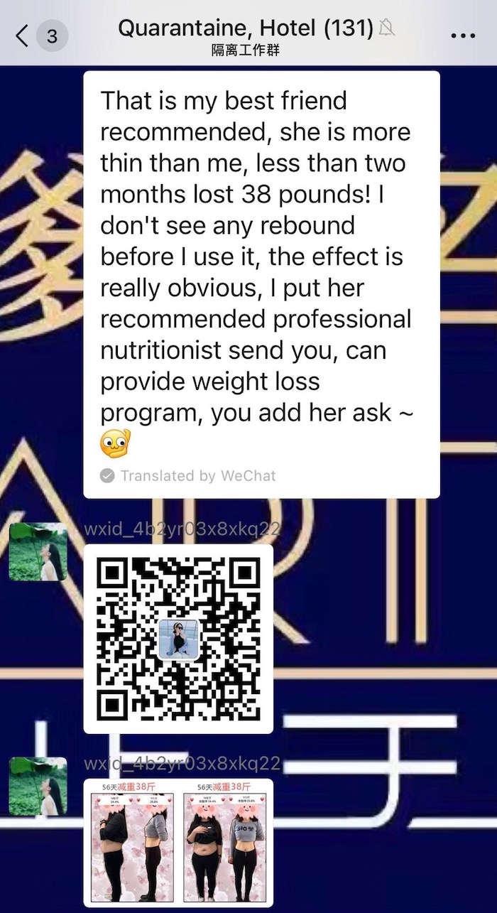 Les Chinois sont depuis toujours réputés pour leur sens du commerce. Même en quarantaine, certains profitent du large groupe WeChat des locataires de l’hôtel, pour y faire de la pub ! Celle-ci vante une méthode d’amaigrissement, il faut croire que certains sortent confits de ces deux semaines de confinement… D’un autre côté, la petite superette en bas de l’immeuble est aussi membre de ce groupe, permettant aux résidents de passer commande de produits de première nécessité et autres douceurs pour améliorer le confort de leur séjour. Ils doivent être de mèche !