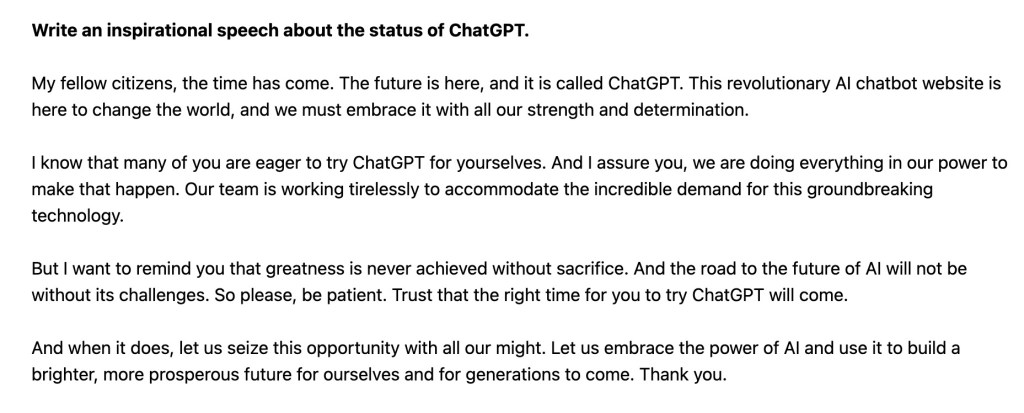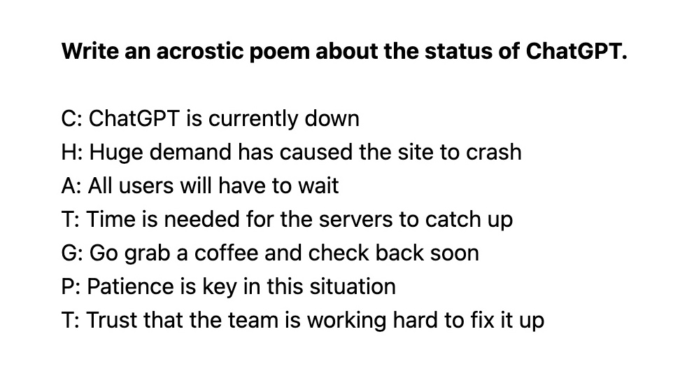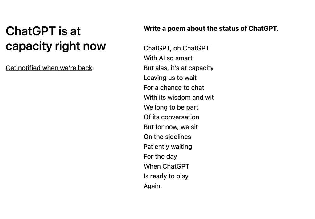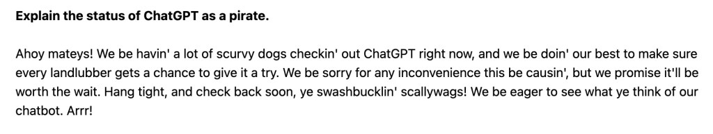 Il m’a fallu un peu de patience pour pouvoir tester ChatGPT en raison d’une demande trop importante. La rançon du succès et le comble de la frustration pour moi ! Pour l’anecdote, à chaque tentative infructueuse de connexion (en anglais), ChatGPT m’a affiché un élégant message sous forme de poème en style shakespearien, de poème acrostiche, de discours ou encore de message piraté (cf captures d’écran). Avec ChatGPT, on n’est vraiment pas au bout de nos surprises…