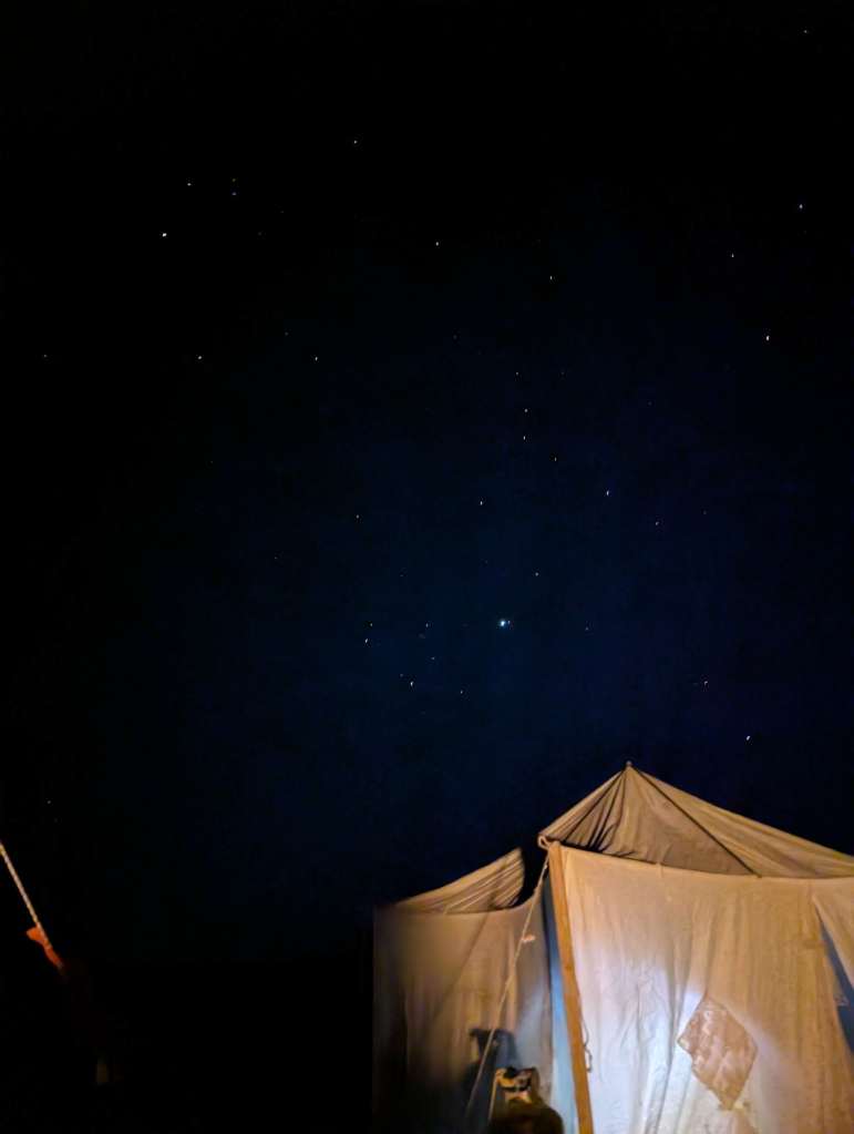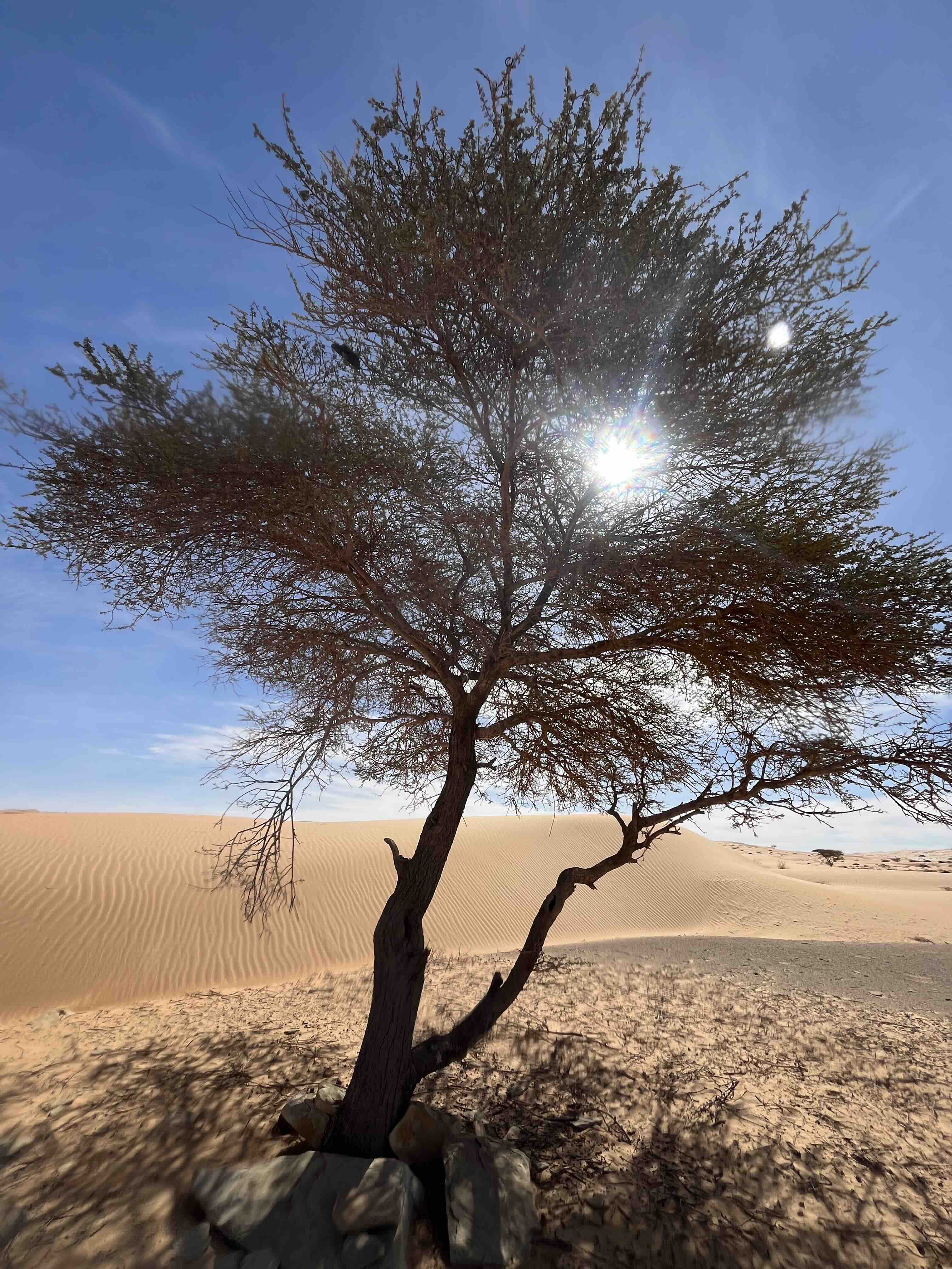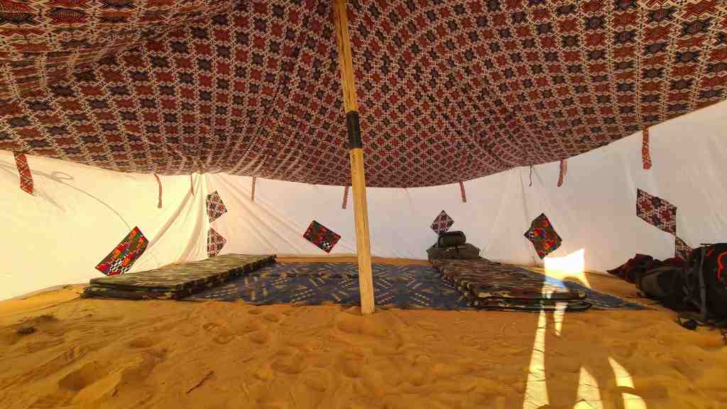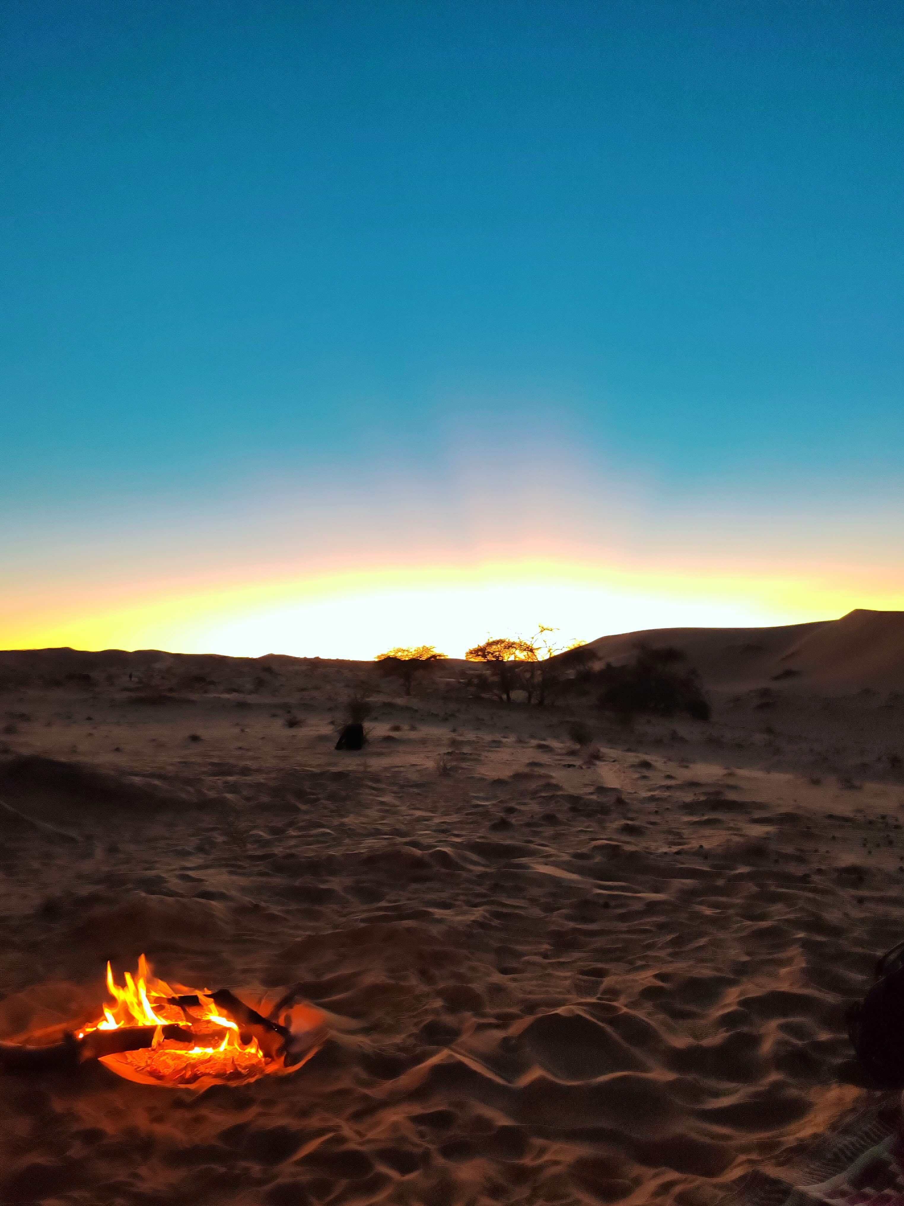Après une chaude et longue après-midi entre sables et rocailles, balayée par des vents de plus en plus forts (le chèche bleu sera notre meilleur ami !), nous arrivons à notre premier bivouac sur le site Magleg Ekl Elbeyede. Nos jambes se sont bien dérouillées pour un premier jour de marche, avec quelques 30.000 pas et plus de 16 km. Notre tente commune dans laquelle nous dormirons à 5, 6 ou 7, selon les envies de belle étoile, est plantée. Deuxième coucher de soleil de la semaine, qui laisse bientôt place à la voûte céleste avec la même magie renouvelée. Mohamed en profite pour nous donner quelques premières clefs de compréhension de son pays, avant de nous laisser nous écrouler de fatigue avant 22h !