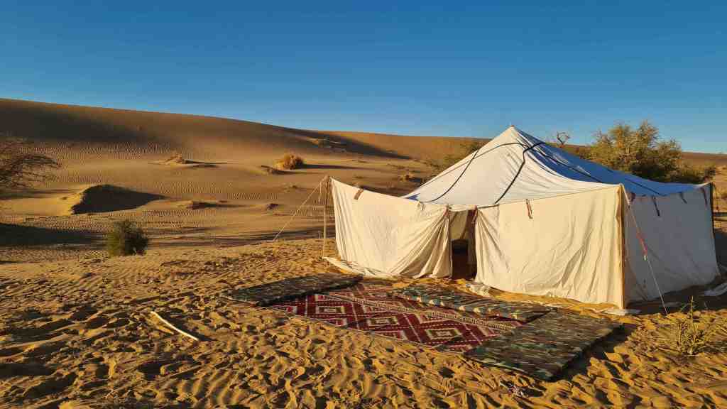 Autre première du séjour, le paquetage matinal de nos gros sacs… Car c’est toute une routine, que nous allons progressivement perfectionner, ou plutôt simplifier au maximum, pour enfin frôler la perfection, mais surtout la célérité, à la toute fin de notre trek ! Voyez plutôt : rouler son sac de couchage au plus serré, dégonfler son oreiller, ranger tout ce qu’on a déballé la veille (des p’tits sacs, encore des p’tits sacs, toujours des p’tits sacs), ne garder que l’indispensable – vaste question philosophique -, boucler le gros sac que les dromadaires porteront, préparer son petit sac à dos de journée avec : de quoi être à l’aise entre la relative fraicheur de l’aube et la chaleur montante de la journée, des pansements, ses gourdes remplies d’eau sans oublier l’indispensable comprimé de désinfection Micropur, du gel hydroalcoolique pour les uns, du paracétamol pour les autres, crème solaire et lunettes de soleil, téléphone chargé pour les photos, bâtons de marche, chèche/hawli bleu et voilà ! Sans oublier le sacro-saint rouleau de papier-toilette, avec son briquet pour ne laisser aucune trace polluante de son passage dans cette mère nature…