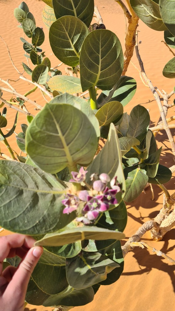 Soudain, le décor change, les arbustes et plantes apparaissent en buissons, nous traversons des plateaux de sédiments granuleux, du grès allant du noir au gris, et Mohamed se lance dans un cours de géologie, puis nous vante les vertus antiseptiques et cicatrisantes de la sève laiteuse du Calotropis procera ou Pommier de Sodome, Arbre à Soie, ou encore Roustonnier.