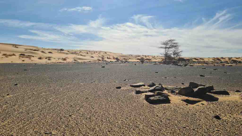 L’après-midi sera faite de sable jaune orangé et de rocailles grises et noires, nous dévoilant dès le premier jour de marche qu’il n’y a ici pas un, mais des déserts…