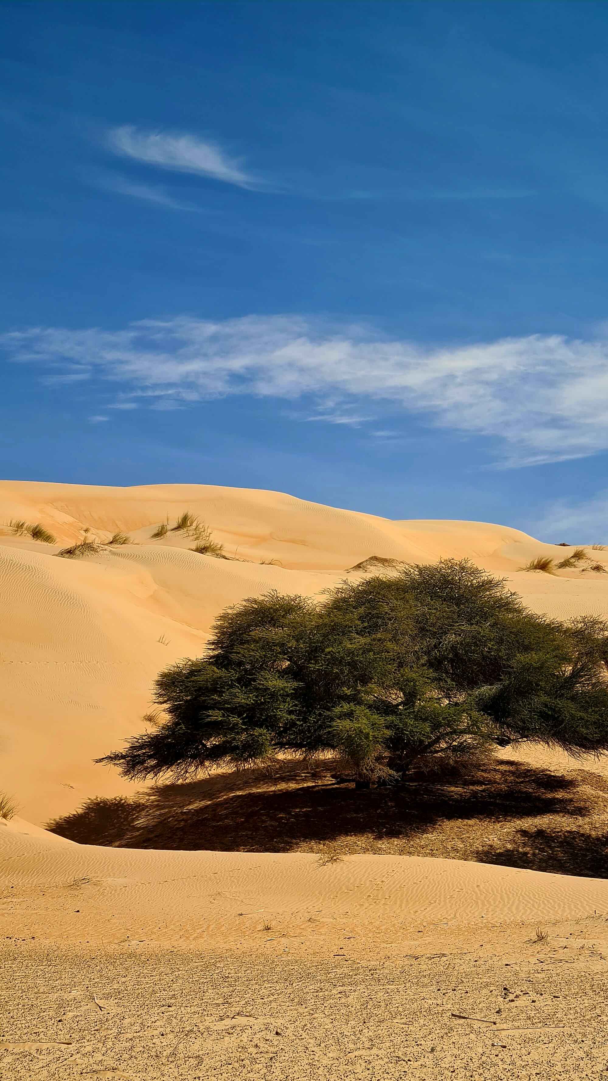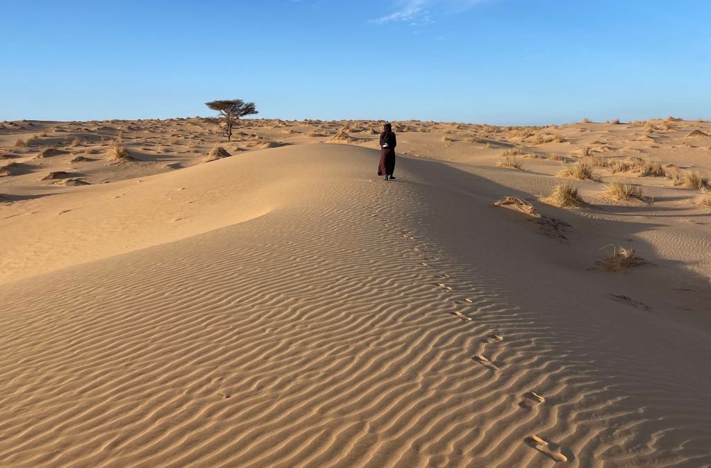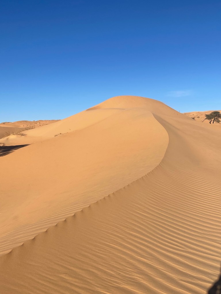 Une fois sortis des larges abords de Chinguetti, nous foulons les dunes de sable fin. Nous montons, nous descendons, nous frisons les crêtes, admirant l’infini orangé qui s’offre à nous, tel un premier cadeau pour nos regards ébahis. Il règne une intense magie dans ces premiers instants…