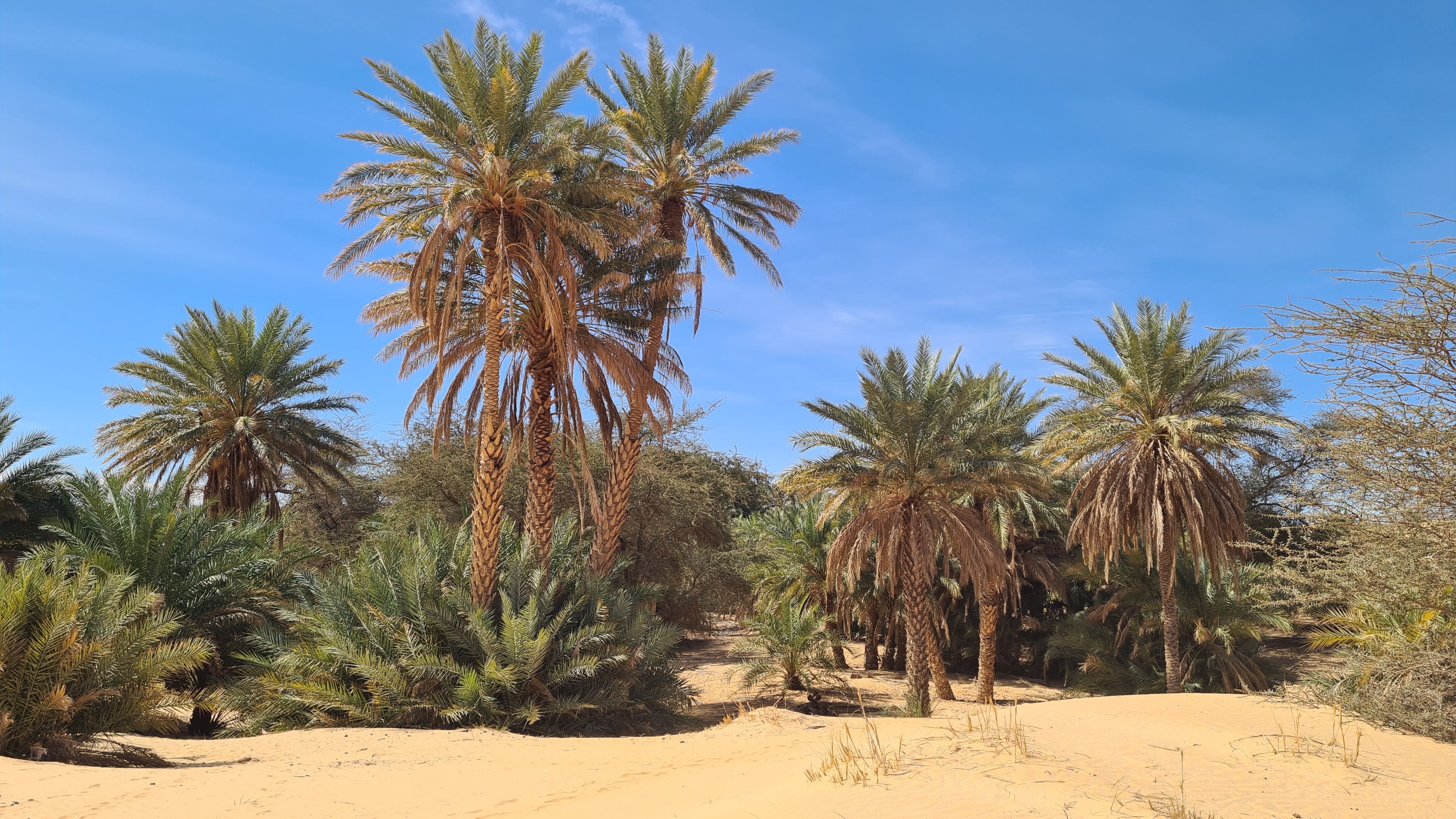 Soyons clairs, les oasis ici n’ont rien à voir avec l’image véhiculée par notre imaginaire, nos lectures de Tintin, ou autres photos dubaïotes ! A l’image de ce pays, et de bien d’autres en Afrique, l’oasis ici est authentique, simple, sans chichis, sans trace d’abondance ni de confort. La source d’eau est ici un simple puits doté d’un tuyau flexible en plastique, presque caché au milieu de la végétation et de palmiers bien fournis, aux promesses ombragées. En deux temps trois mouvements, notre équipage de chameliers nous installent dans un recoin une toile tendue au-dessus de quelques nattes et matelas (nos futurs lits). Cette première pause est délicieuse ! Le fameux thé à la menthe, accompagné de ses succulentes dattes, cacahuètes brutes et biscuits de chamelier subliment l’instant, pendant que notre cuisinier Boulah s’affaire à nous préparer un déjeuner complet aussi simple que bon : du riz, des légumes, des sardines et en dessert une orange. Après un temps de sieste, lecture, mots fléchés ou journal de bord, nous reprenons la route.
