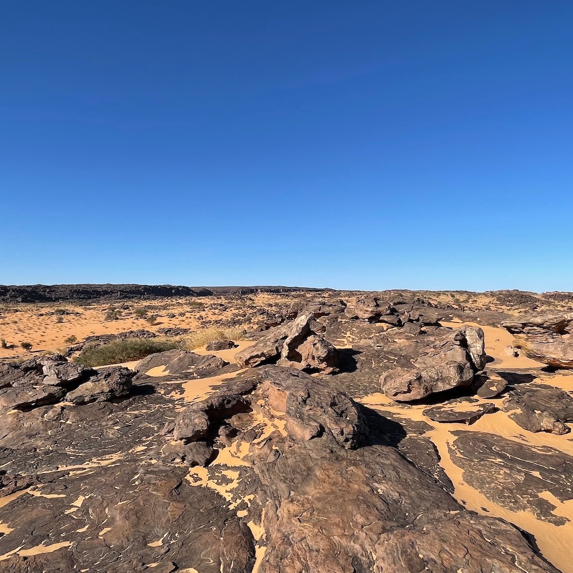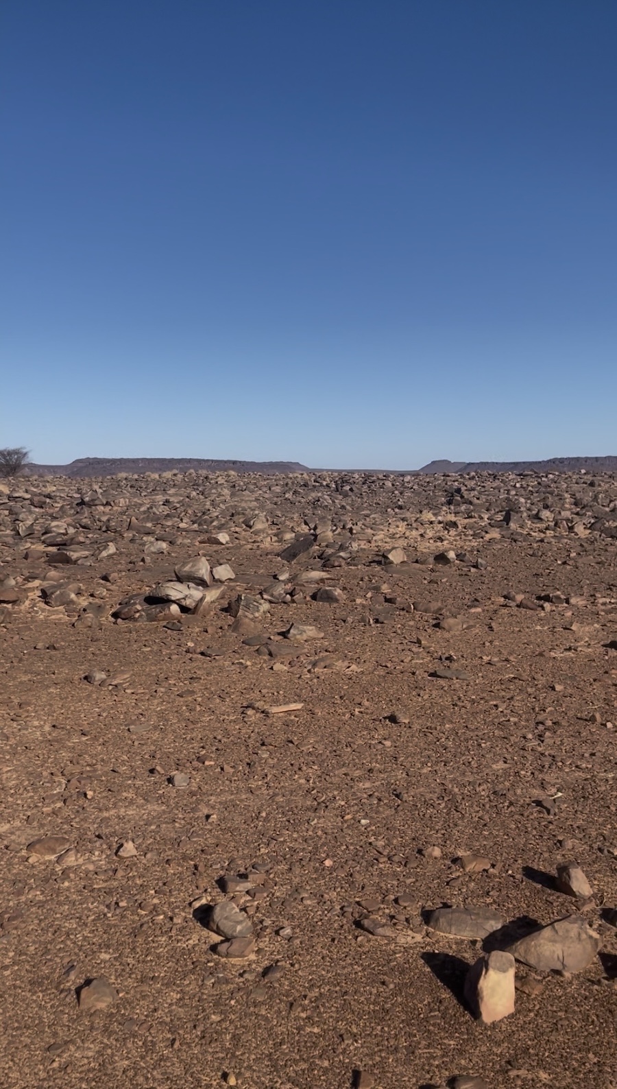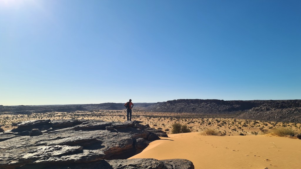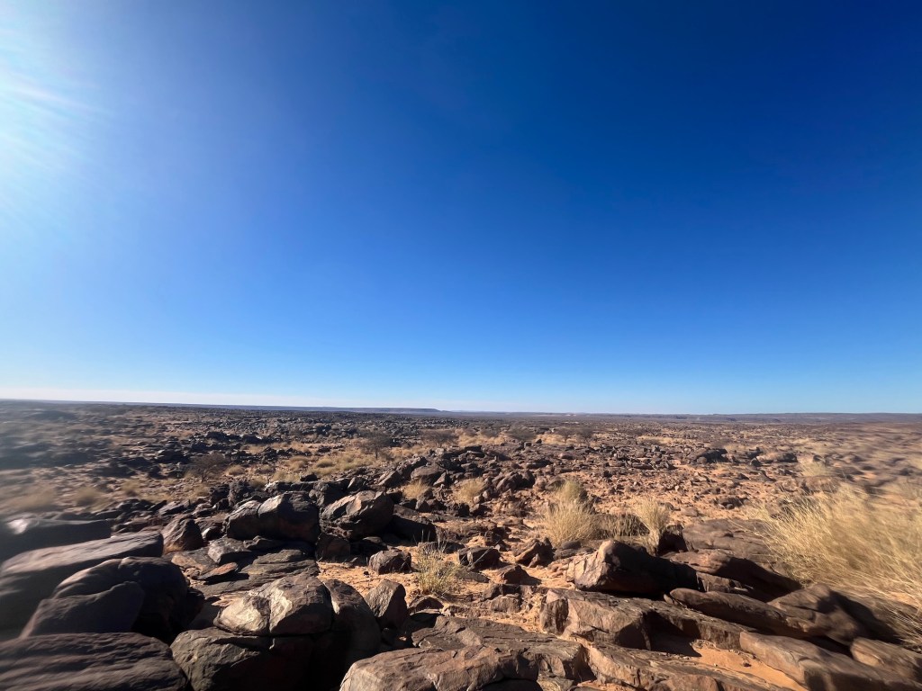 Nous quittons notre charmant bivouac de la veille pour attaquer une ascension assez raide de la petite montagne face à nous, slalomant entre les rochers. La vue en haut est encore plus stupéfiante que celle de la veille ! Le plateau de Vares est une vaste étendue infinie de désert rocailleux offrant un panorama à 3600. Je me demande quelle a été la dernière fois que j’ai pu admirer une telle vue circulaire sans aucun obstacle à l’horizon… On se croirait sur la lune !