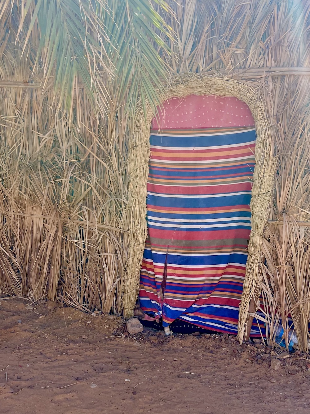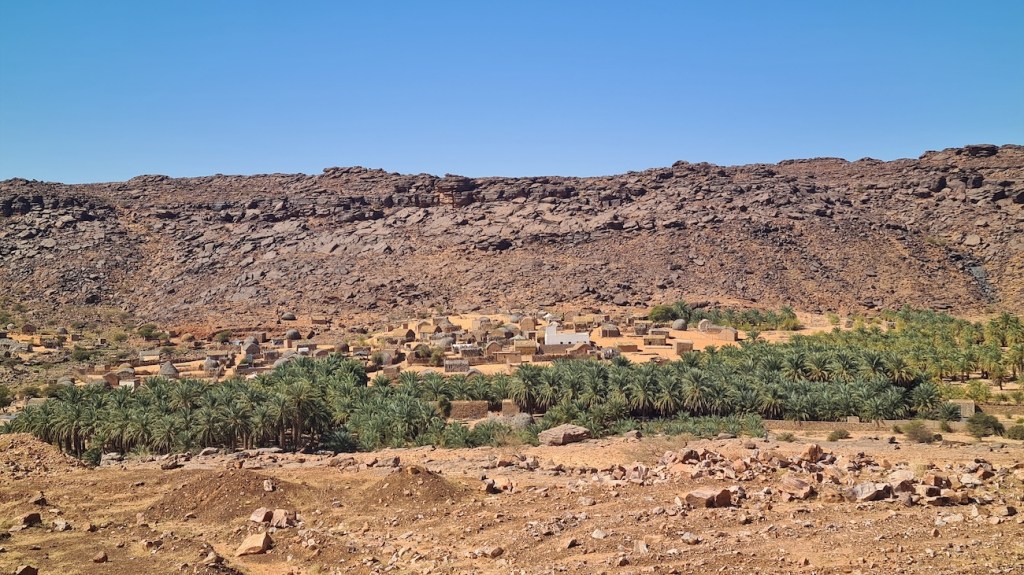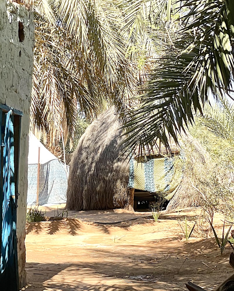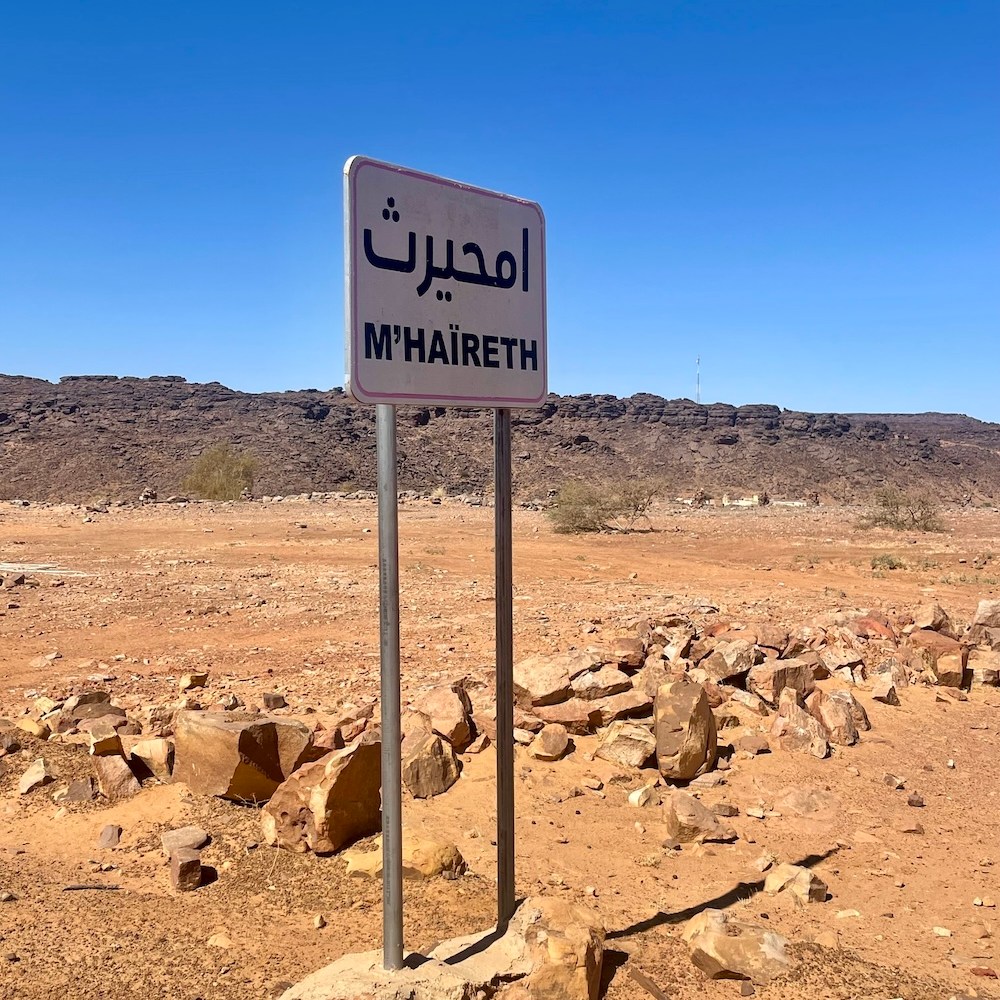 M’Haireth est l’une des plus grandes oasis de l’Adrar mauritanien – qui en contient environ 60 – puisque sa palmeraie fait plus de 7 km de long, certains disent même 10 ou 15 km ! Située entre le mont Zarga et l’oasis de Tergit, elle est un véritable poumon végétal et économique local. Elle s’illustre par ses huttes en palmes tressées au toit arrondi appelées tikits, dont les portes sont constituées de toiles de tissus chatoyants. Il n’est pas rare d’y voir une antenne TV ou satellite plantée au sommet ! Mohamed nous explique que cette oasis est très prisée des citadins d’Atar durant l’été, lorsque la température dépasse les 450. Ici au moins, il y a l’ombre des palmiers et quelques points d’eau pour se rafraichir…
