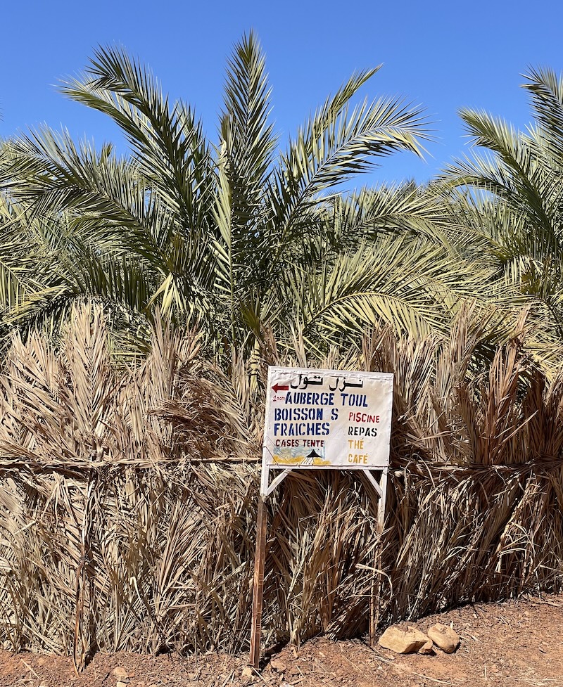 La spécialité de M’Haireth, ce sont ses dattes bien sûr, fruit de ses nombreux palmiers. Elles sont d’ailleurs réputées pour être les meilleures de la région. Nous entrons dans l’enclos de l’auberge Toul (cela ne s’invente pas !) et prenons place sur les matelas et coussins, disposés sous une toile tendue entre les palmiers : quel confort pour nos séants et nos jambes ! Et comble du luxe, il y a effectivement une petite piscine, de style jacuzzi, et de vraies toilettes. On est bien peu de choses après cinq jours dans le désert…