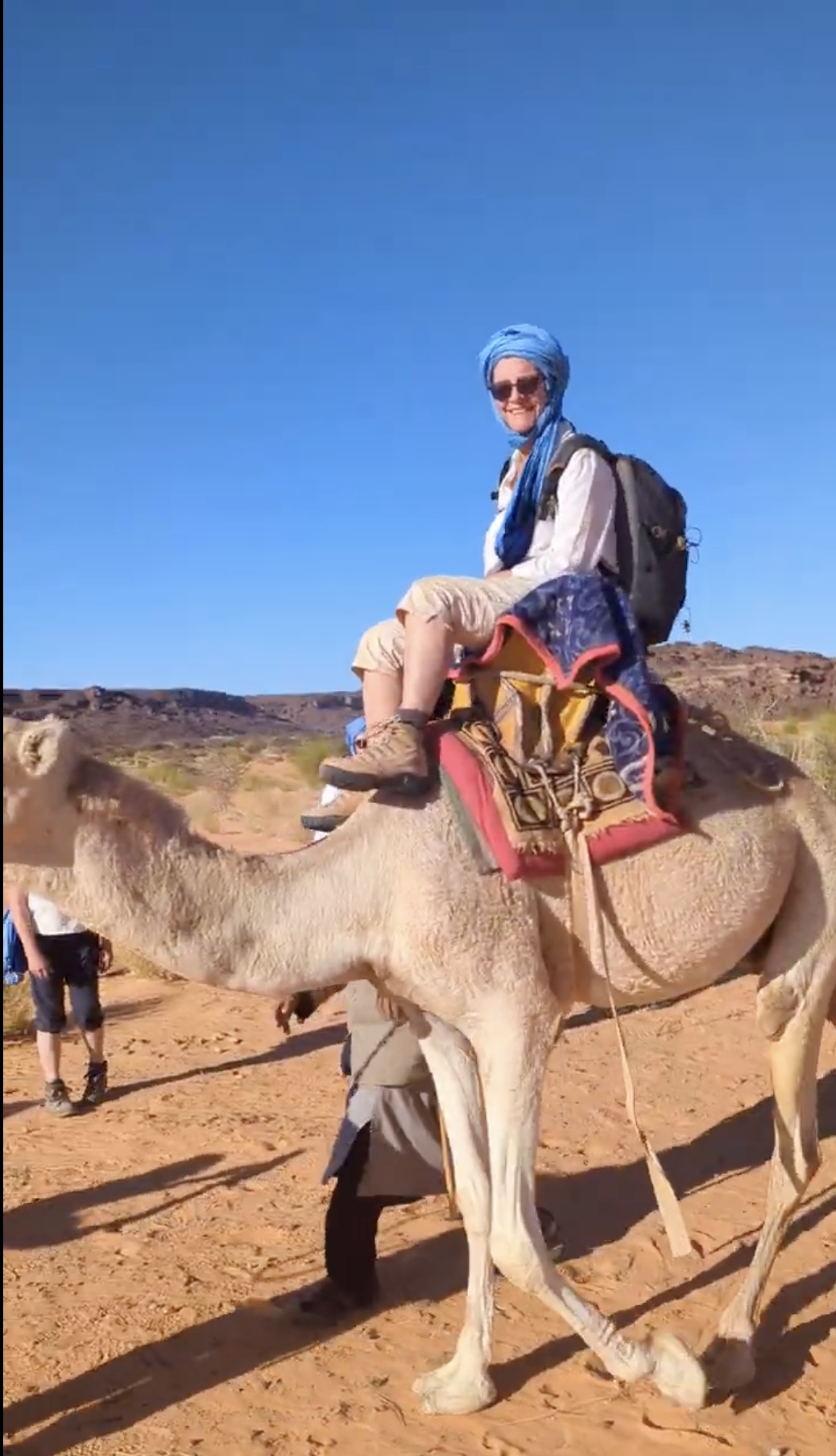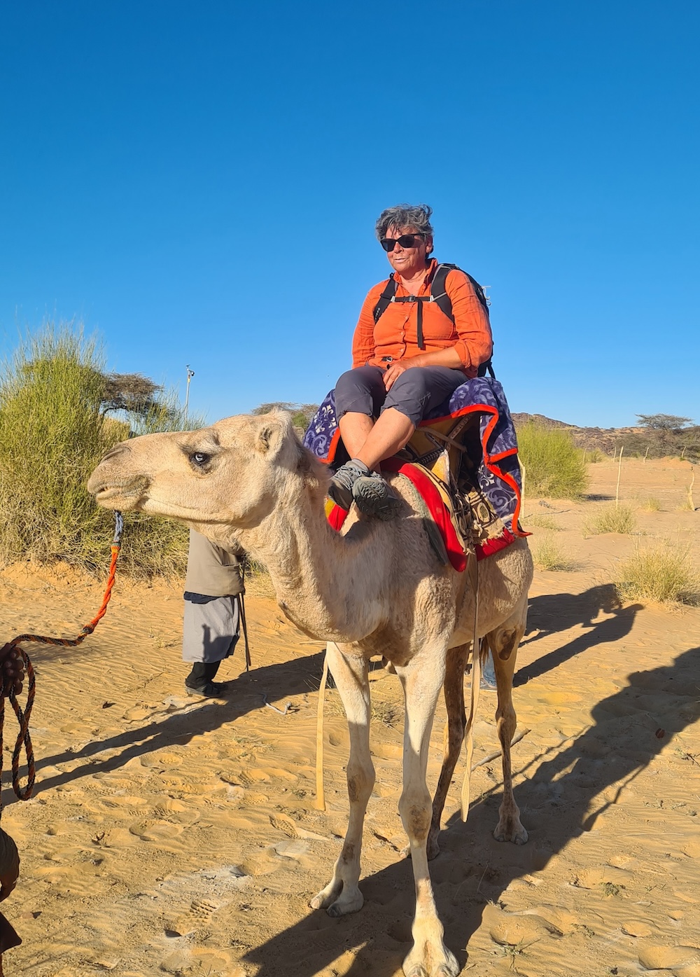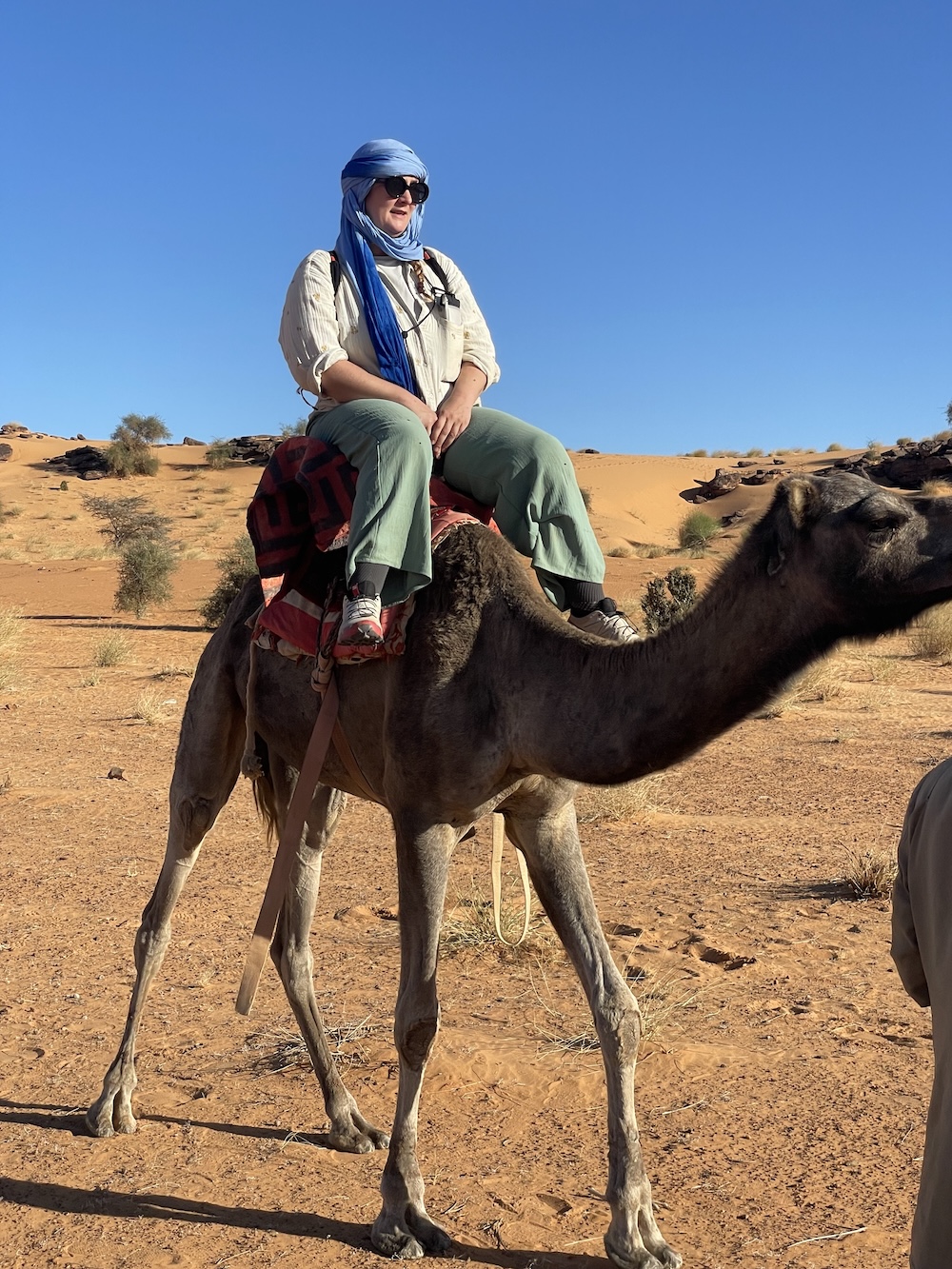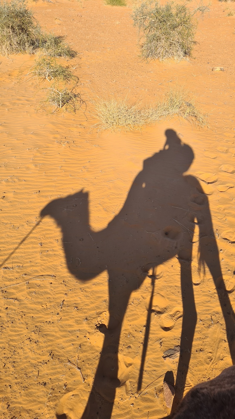 La surprise de l’après-midi sera de retrouver nos dromadaires avant le bivouac, délestés de nos sacs. C’est la séquence touristique tant attendue du tour en dromadaire ! Entre appréhension, grosse rigolade, pitié pour nos montures et émotion pour Ulrique de symboliquement renouer avec ses racines, nous rejouons, avec un peu d’imagination, une scène de Lawrence d’Arabie (pas très 2026 tout ça…)