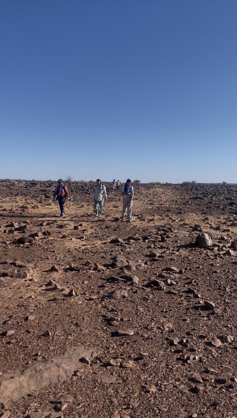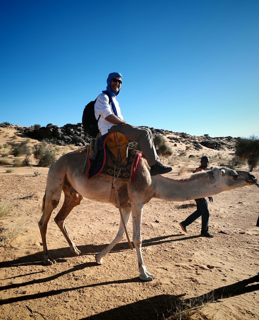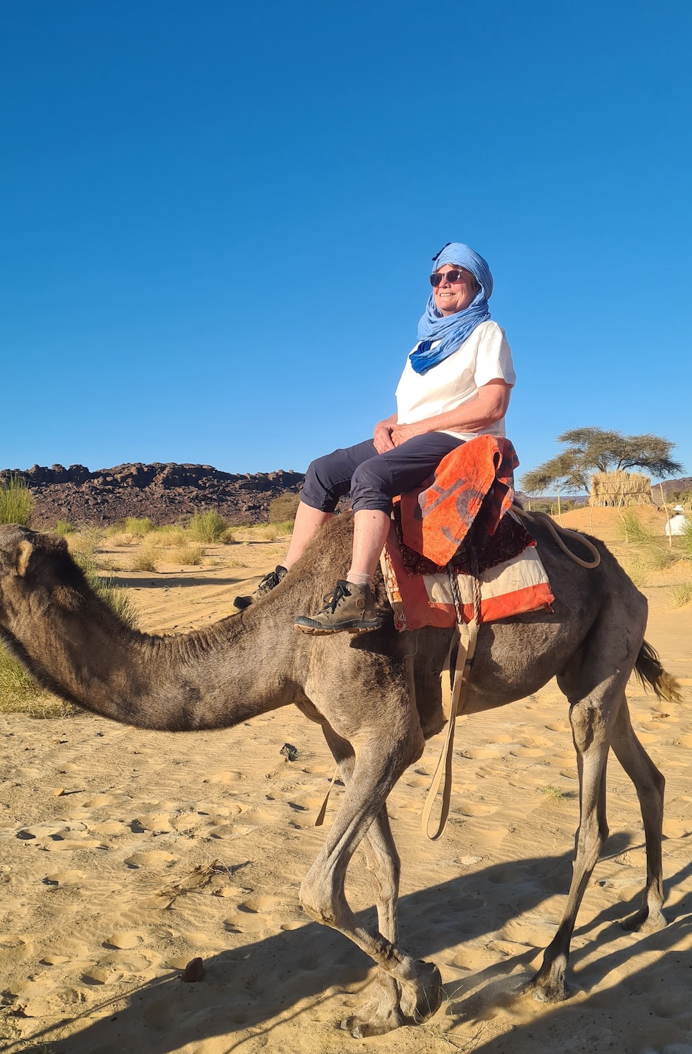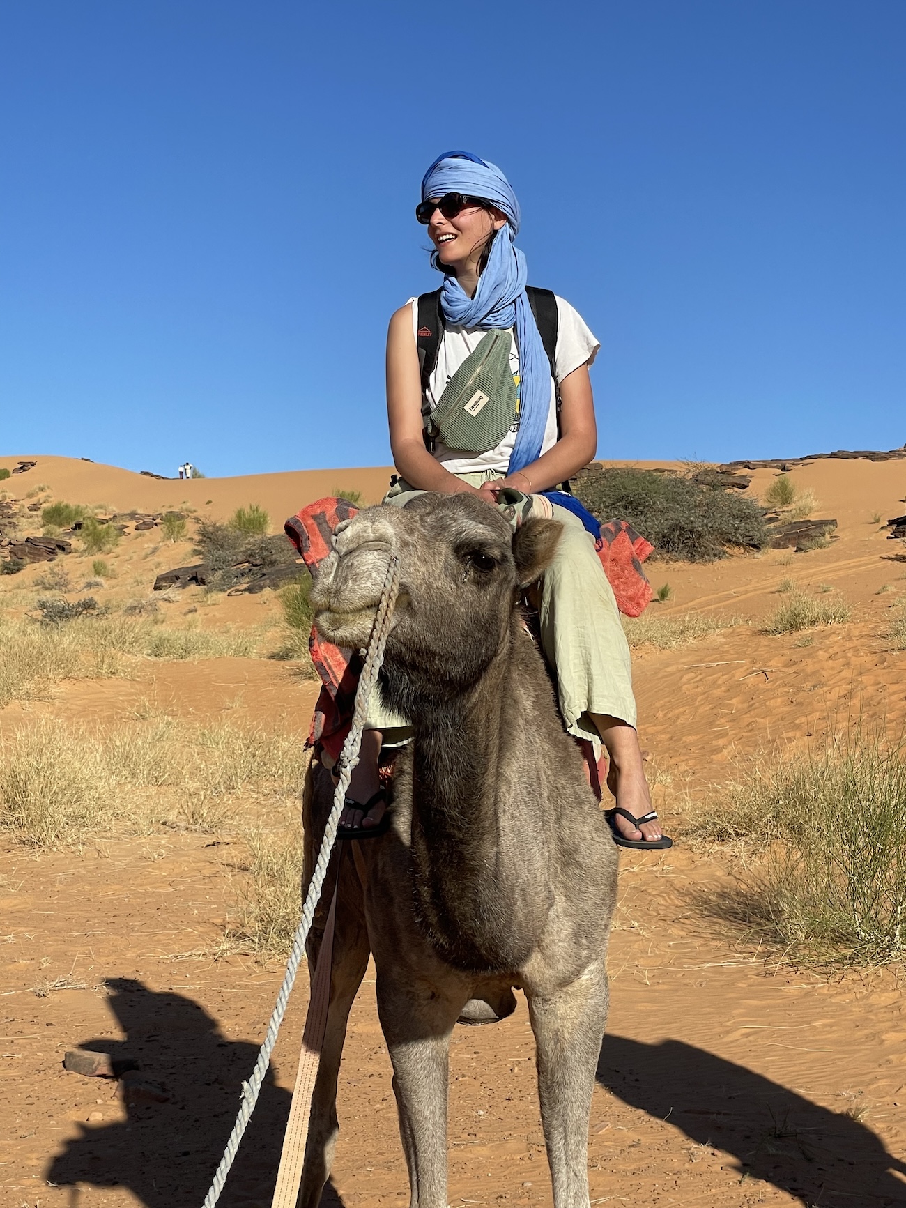 La surprise de l’après-midi sera de retrouver nos dromadaires avant le bivouac, délestés de nos sacs. C’est la séquence touristique tant attendue du tour en dromadaire ! Entre appréhension, grosse rigolade, pitié pour nos montures et émotion pour Ulrique de symboliquement renouer avec ses racines, nous rejouons, avec un peu d’imagination, une scène de Lawrence d’Arabie (pas très 2026 tout ça…)