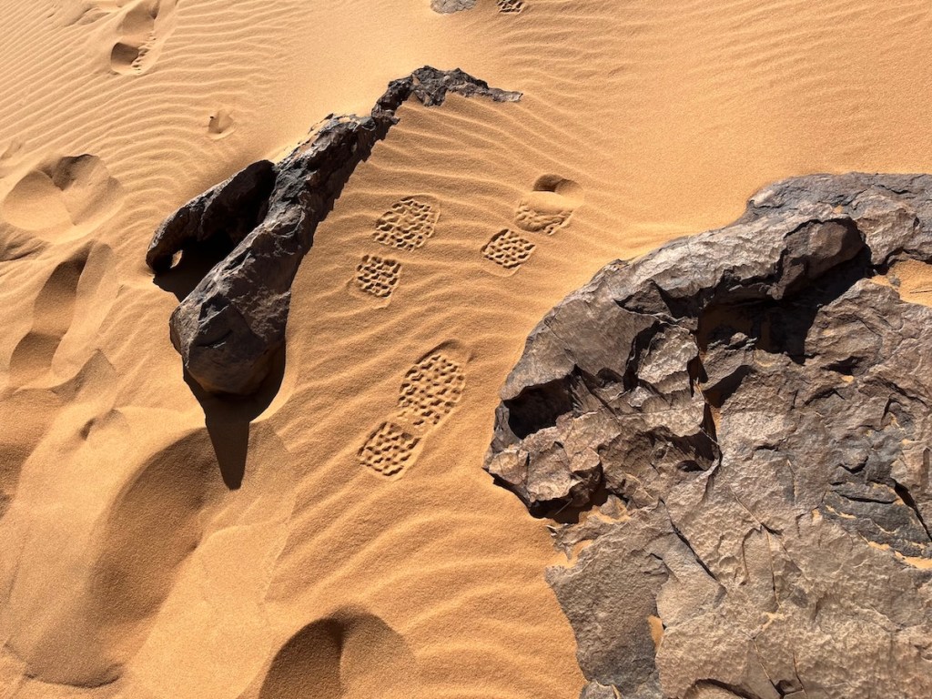 Poursuivant notre progression, nous redescendons vers l’oued Ichif, et retrouvons avec bonheur le sable soyeux des dunes.