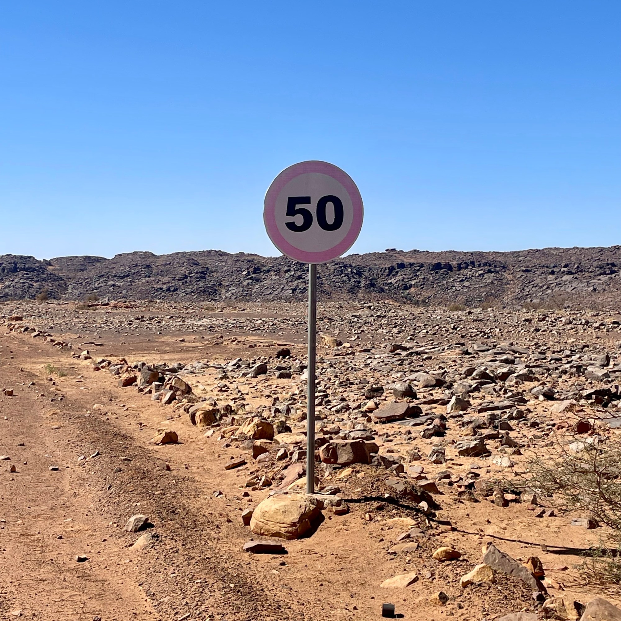 Mais après la montée, il faut bien redescendre, dans tous les sens du terme… Au bout du plateau de Vares, nous entamons donc la descente jusqu’à une étonnante route, une large piste de cailloux et de terre, qui s’étire loin devant nous. La civilisation reprend peu à peu ses droits puisque nous croisons quelques panneaux de signalisation assez incongrus dans ce décor, sans vraiment comprendre à qui ils s’adressent !
