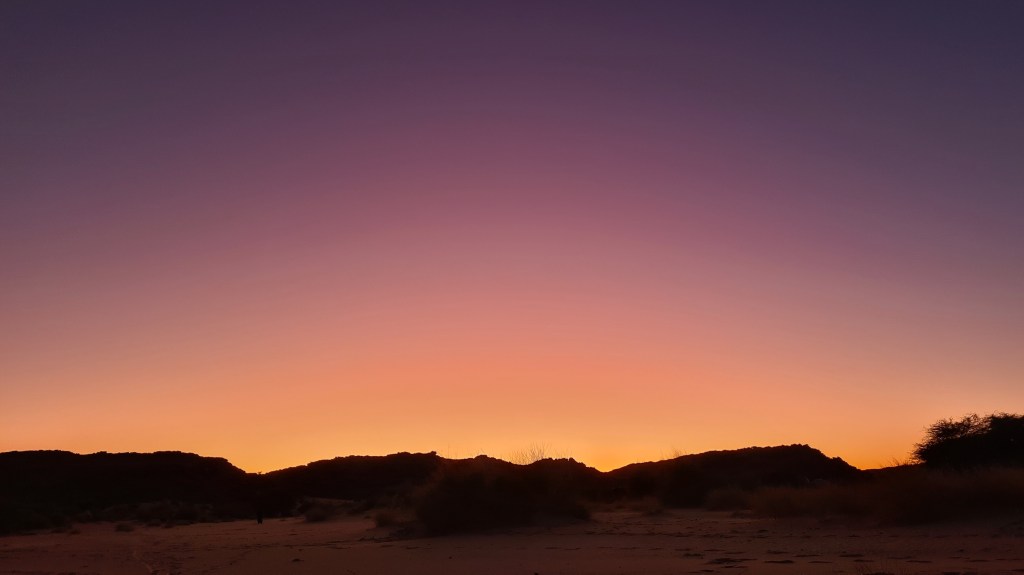 Le coucher de soleil sera rougeoyant à souhait pour notre dernier soir dans le désert…