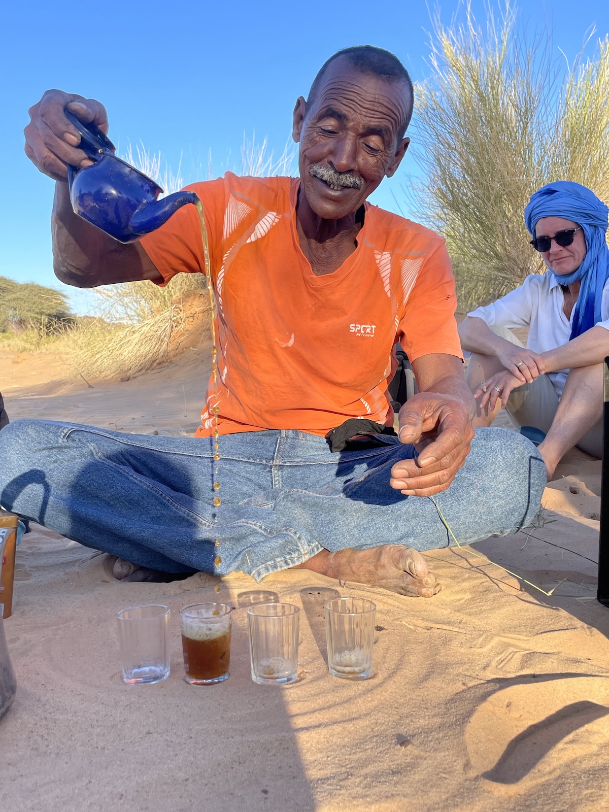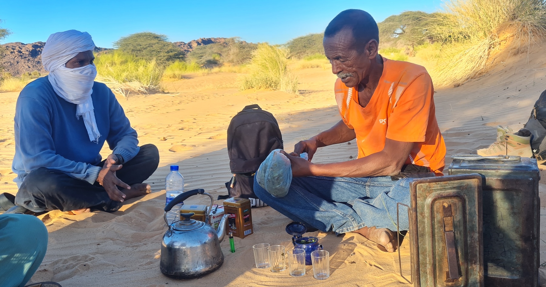 Arrivant sur notre lieu de bivouac, Mohamed se livre, à notre demande, à une cérémonie pédagogique du thé à la menthe, nous détaillant chaque étape, afin que nous puissions tenter de reproduire la scène une fois rentrés chez nous : un demi-verre de thé, de la menthe, juste un peu de sucre, de l’eau pas trop chaude, et voilà ! Rappelez-vous :