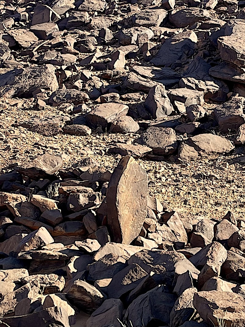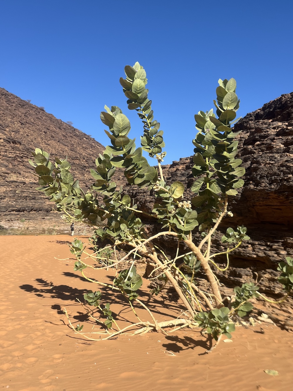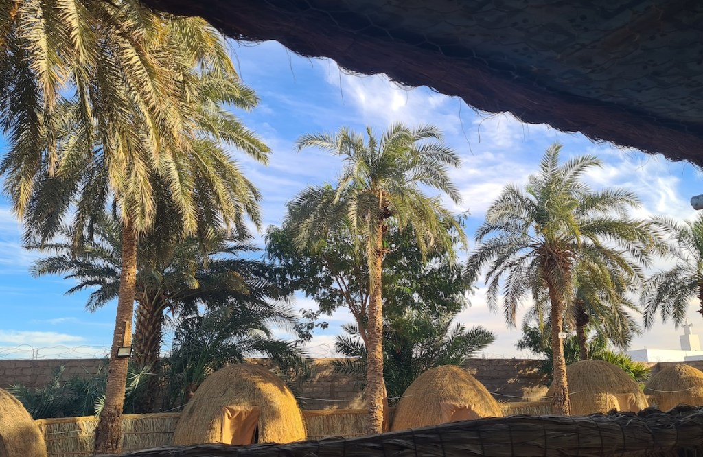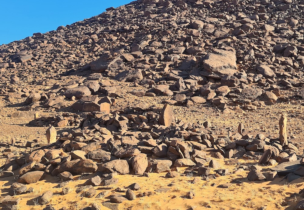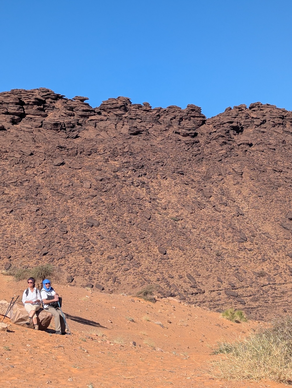 Nous entamons donc avec entrain, et une pointe de nostalgie, notre marche matinale, bien moins anodine qu’il ne semble. Car nous allons vivre en peu de temps un véritable condensé de notre semaine : du sable, des rochers, quelques plantes, des palmiers, une vue panoramique encore époustouflante, le tout sous un ciel bleu Klein ! Nous croisons même d’humbles tombeaux pré-islamiques !