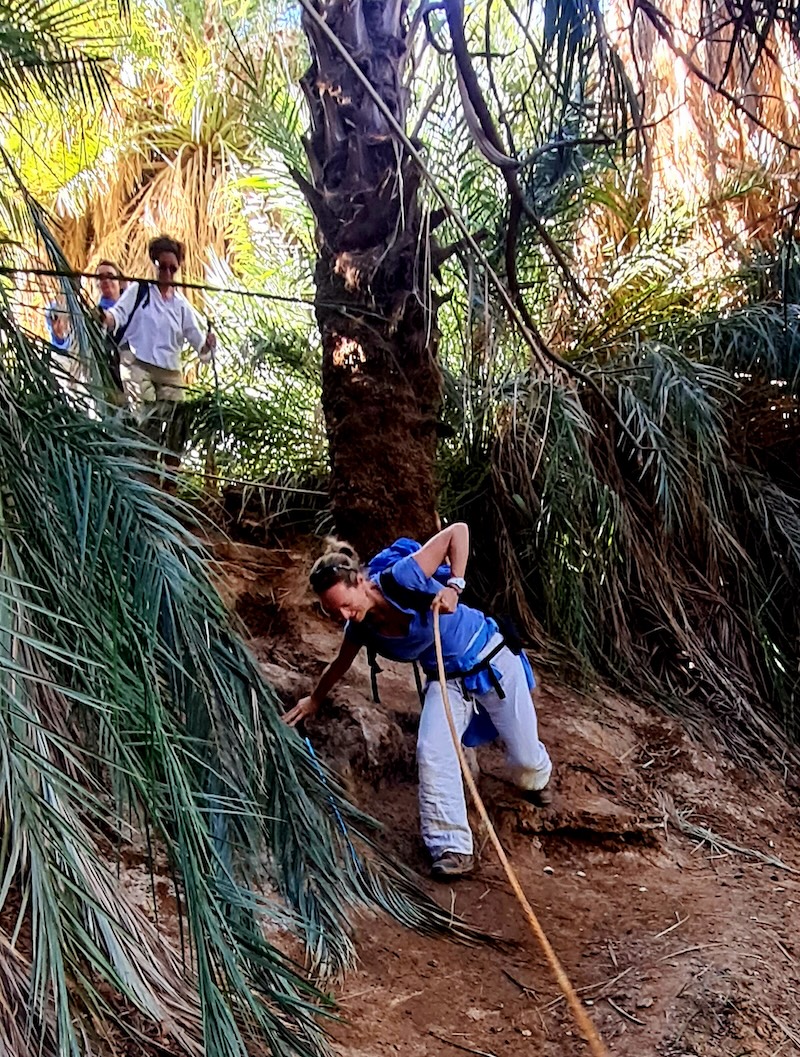 La descente s’amorce en douceur. Puis le chemin se resserre et sillonne vers une paroi de falaise. Le sol sablonneux est ocre comme jamais, les palmiers se multiplient, l’humidité se fait progressivement ressentir, avec un parfum de jungle. La pente s’accentue, quelques grosses pierres, une corde même pour se tenir, un gué à traverser, on entend quelques voix au loin et un bruit d’eau qui coule.