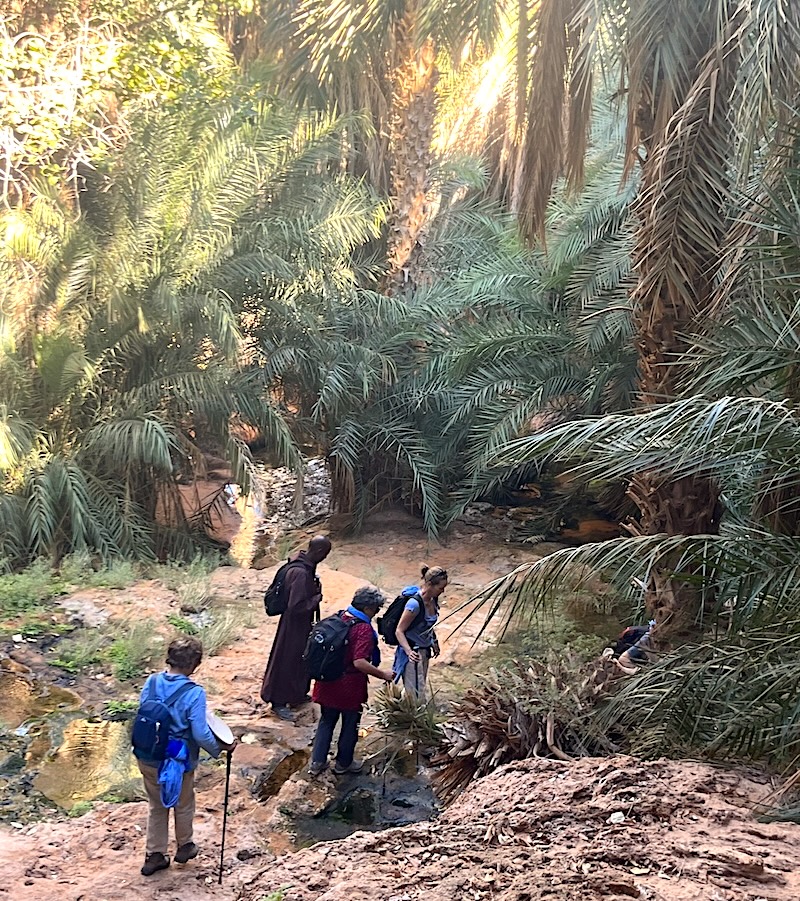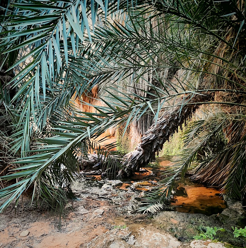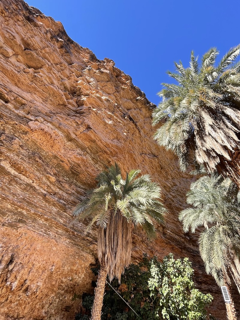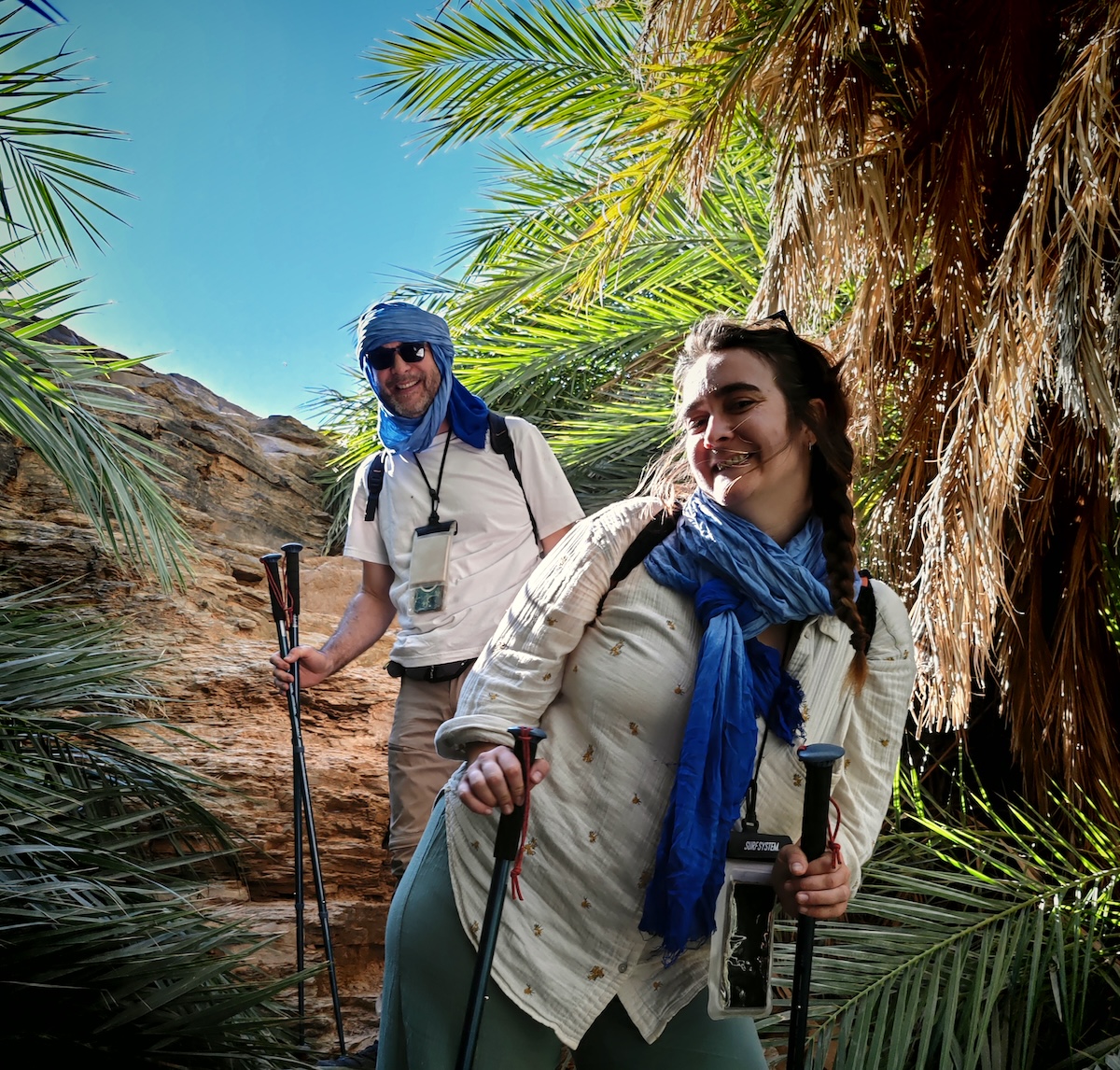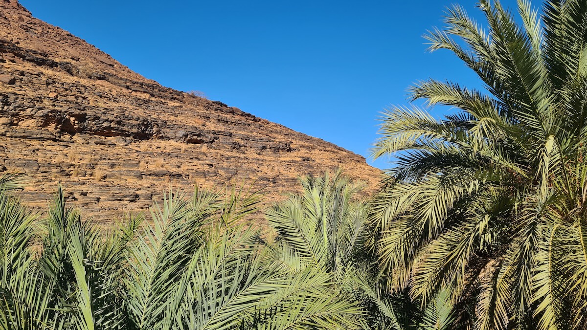 Soudain, comme par enchantement, encore timidement cachée derrière des feuilles de palmier, l’oasis apparait ! Tout en longueur, elle se dévoile peu à peu : un ruisseau qui court, un bassin propice à la baignade, de nombreux palmiers, l’ombre des falaises qui l’encadrent et quelques tentes colorées : voici Terjit la belle !