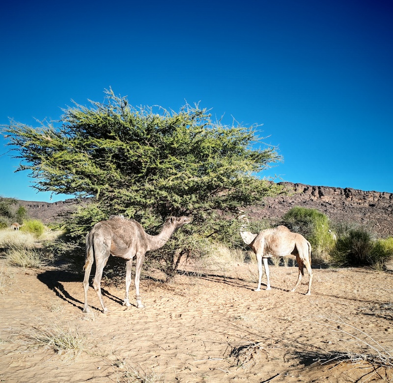 Nous quittons notre bivouac avec plusieurs pensées qui se bousculent en vrac dans nos esprits. Pour nous, une page se tourne : sur le désert, sur cette vie au rythme du lever et du coucher du soleil, sur les longues et précieuses journées de marche et d’échanges, sur les soirées autour du feu avec Mohamed, sur les nuits étoilées, sur les selfie-dromadaires…