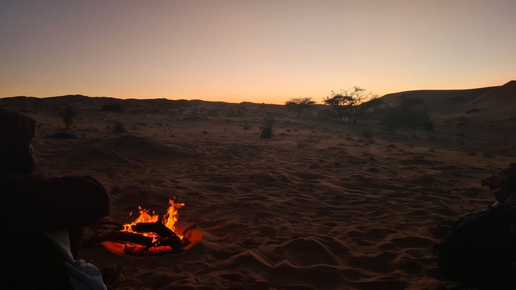 Avec son humour incisif, mais aussi parfois avec grand sérieux et une érudition certaine, Mohamed s’est un peu livré à nous au cours de cette semaine, lors de discussions autour du feu ou au détour de nos dégustations de thé à la menthe. Avec humanité, authenticité et sincérité, il a répondu à nos nombreuses questions (trop parfois à son goût), nous surprenant par son esprit critique et sans filtre, d’habitude si français. Voici quelques-uns des sujets abordés : sa passion du désert, la beauté du ciel étoilé, le tourisme dans le désert, les ressources de la Mauritanie, le recyclage des déchets, la gestion de l’islamisme radical, le travail des imams auprès des prisonniers djihadistes pour les remettre dans le droit chemin, le décalage entre l’image de la Mauritanie en France et la réalité, mais aussi son activité de guide, ses mois passés en Europe pour se faire connaitre des agences, son amour pour la France etc. Un grand homme et une belle rencontre !