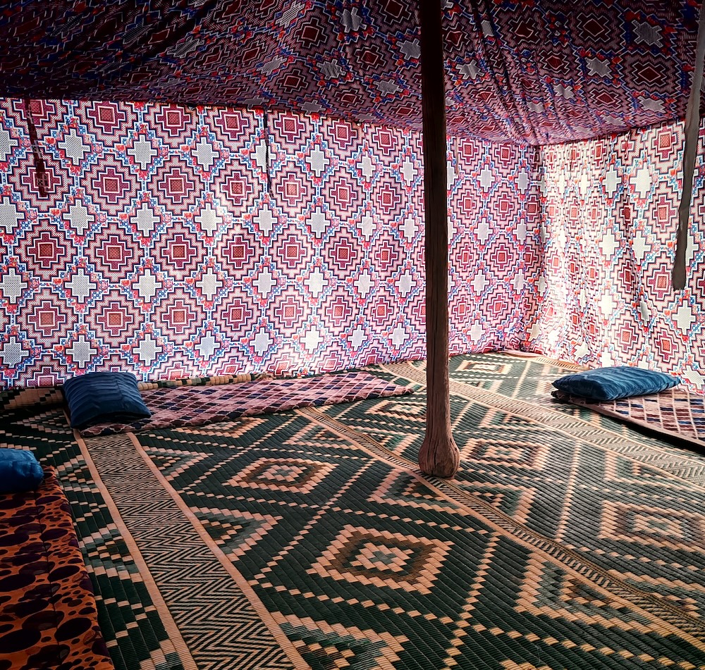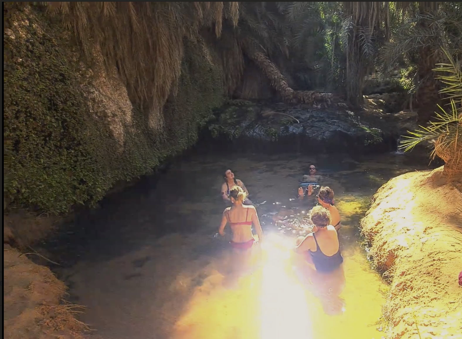 Nous prenons nos quartiers sous une tente, pendant qu’un thé de bienvenue se prépare. Nous sortons les maillots de bain pour vivre l’expérience du bain de Terjit. Nous nous glissons dans ce bassin peu profond (avec plus ou moins de facilité…), tout à la sensation presque oubliée d’immerger son corps dans l’eau. Imaginez la délectation ! A la sortie de ce bain pas comme les autres, nous séchons sous le soleil mi-ombragé, les uns sortent un livre, les autres les mots fléchés, chacun trouve sa place, la magie opère, le temps se suspend.