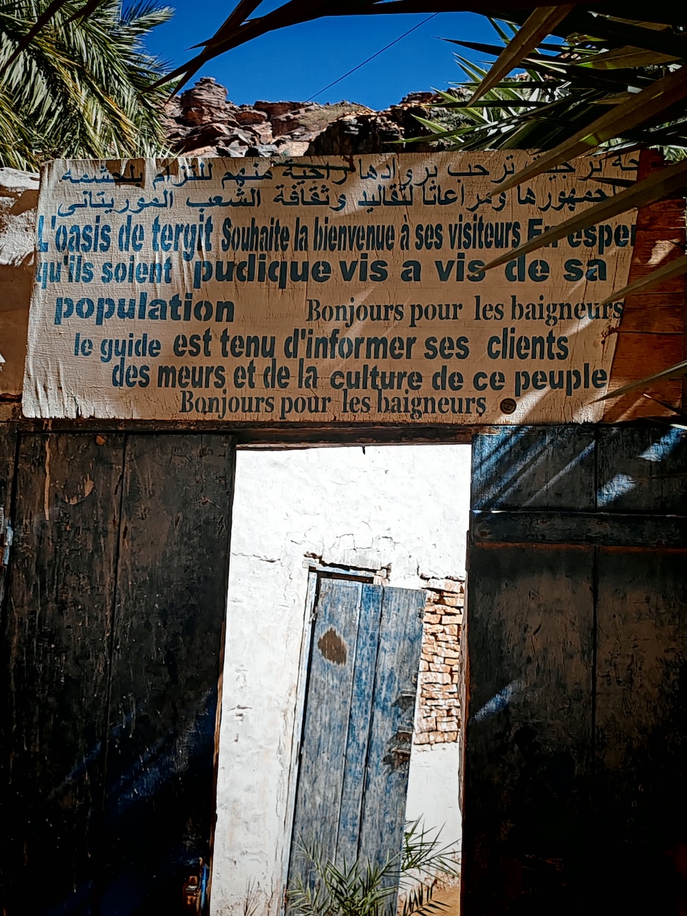 Terjit, rien que ce nom évoque des couleurs, des odeurs, de l’exotisme, du mystère aussi… Située à 50 km au sud de la ville d’Atar, Terjit (ou Tergit) est une des oasis les plus connues de Mauritanie et de la région de l’Adrar. Littéralement nichée, voire cachée, au creux de hautes falaises couleur ocre, elle est irriguée par des sources d’eau chaude et froide qui ruissellent, ou suintent selon le débit, le long des parois, pour être recueillie dans des réservoirs naturels. Très ombragée grâce à ses palmiers et à la hauteur vertigineuse des falaises qui l’encadrent, ce joyau aux portes du désert est extrêmement prisé pendant la saison chaude. C’est aussi une halte iconique pour les randonneurs du désert. L’accueil local est authentique, chaleureux et discret à la fois, simple, presque dépouillé. Terminer un trek dans l’Adrar mauritanien par une pause à Terjit est une chance et un incontournable !