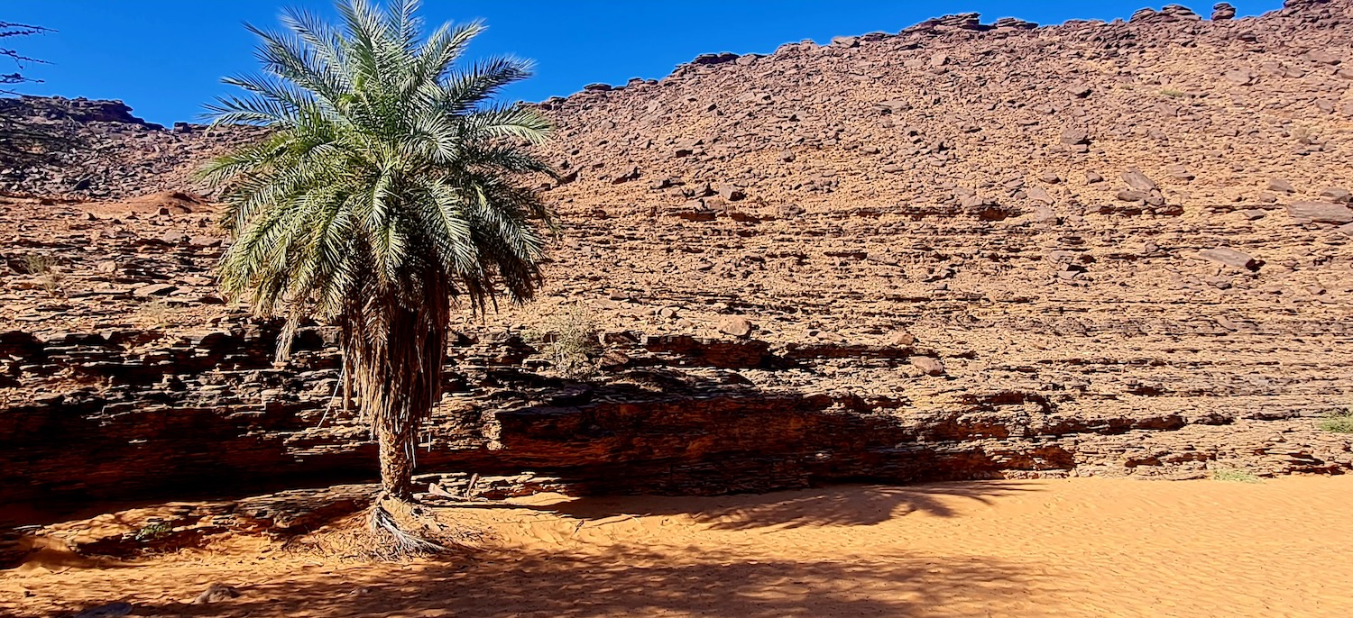 Après un dernier déjeuner sous la tente, Mohamed, déjà investi sur son prochain trek qui démarre le lendemain, nous invite à rejoindre les 4×4 (monopole Toyota) à la sortie de l’oasis, pour rouler vers Atar. En chemin, nous admirons les plantations de palmiers au pied des montagnes, et il nous montre fièrement sa propre plantation !